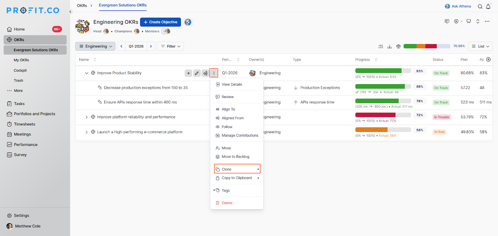 - Click on the More icon (⋯) next to the OKR and select Clone from the dropdown menu.