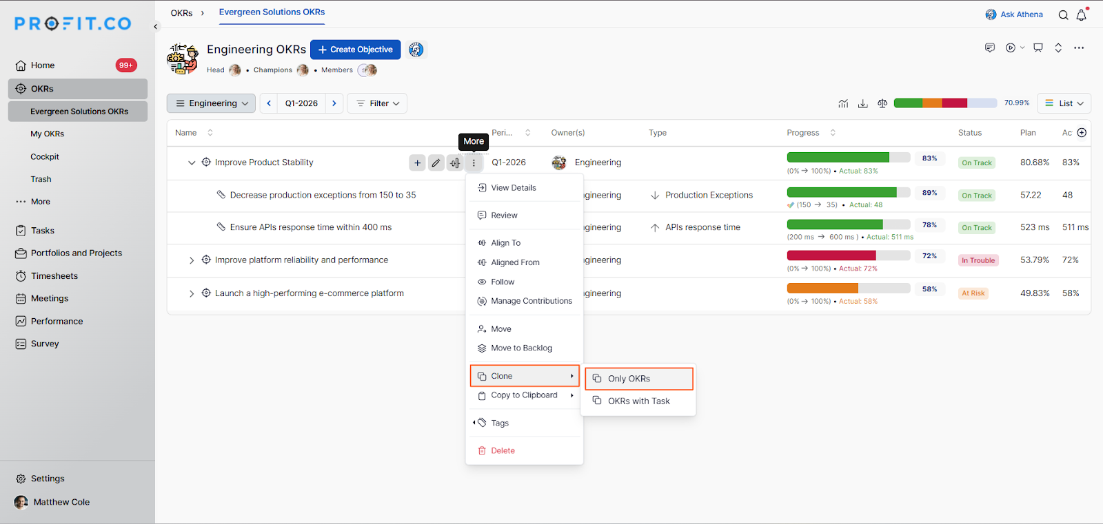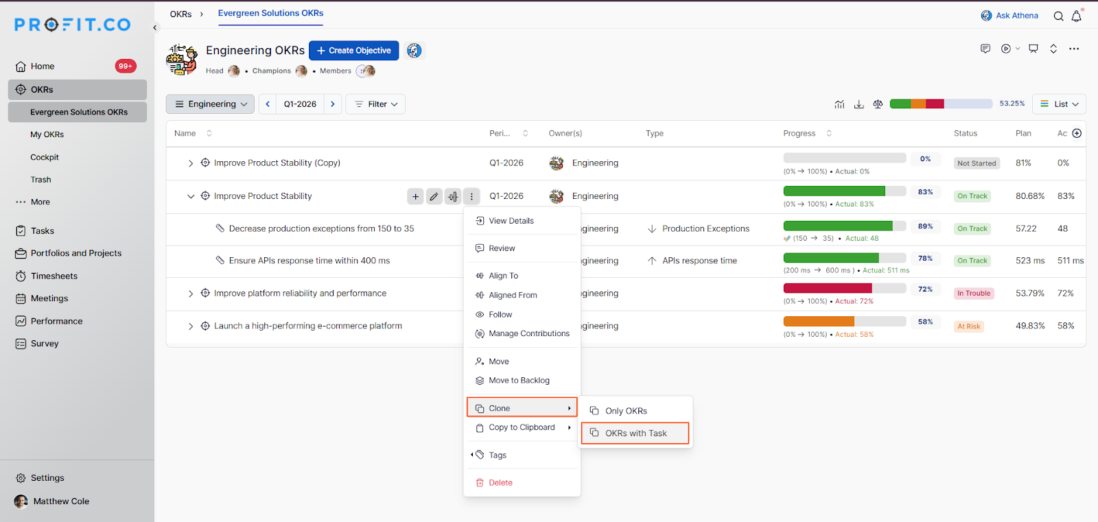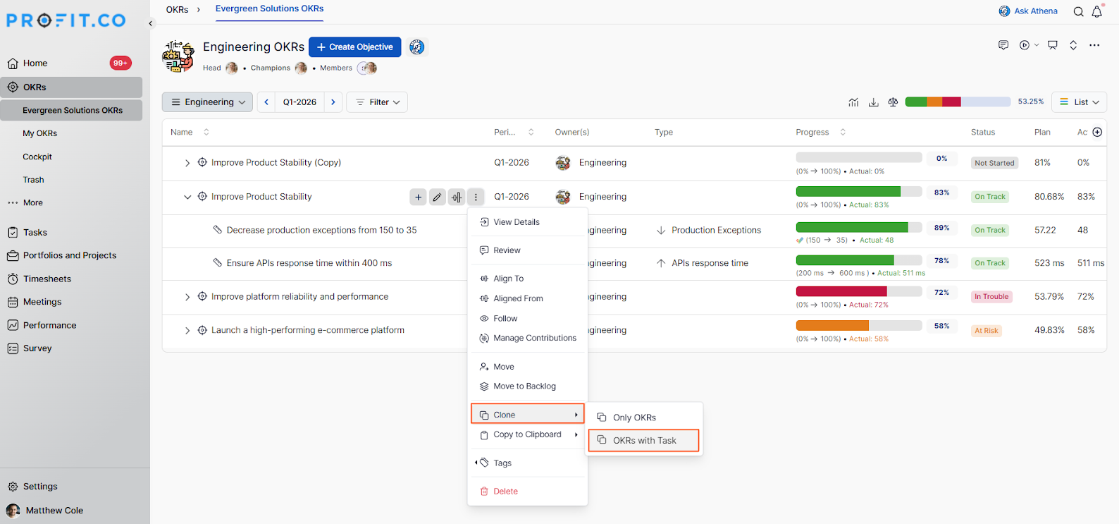 In Profit.co, you can clone or copy existing OKRs to create duplicates, either as OKRs alone or along with their associated tasks, saving time and effort during OKR planning cycles.