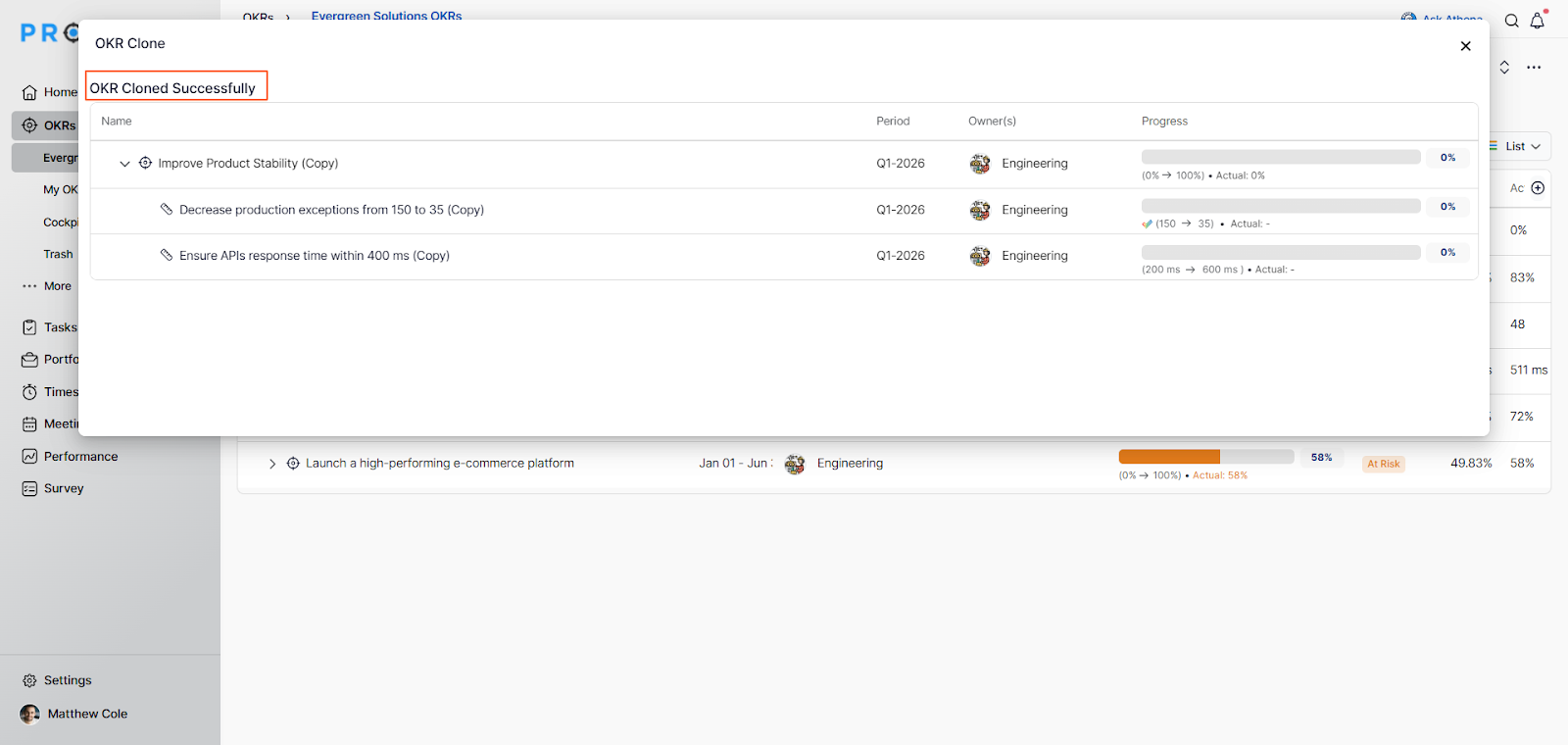 - A pop-up notification will confirm that the OKR has been cloned successfully.