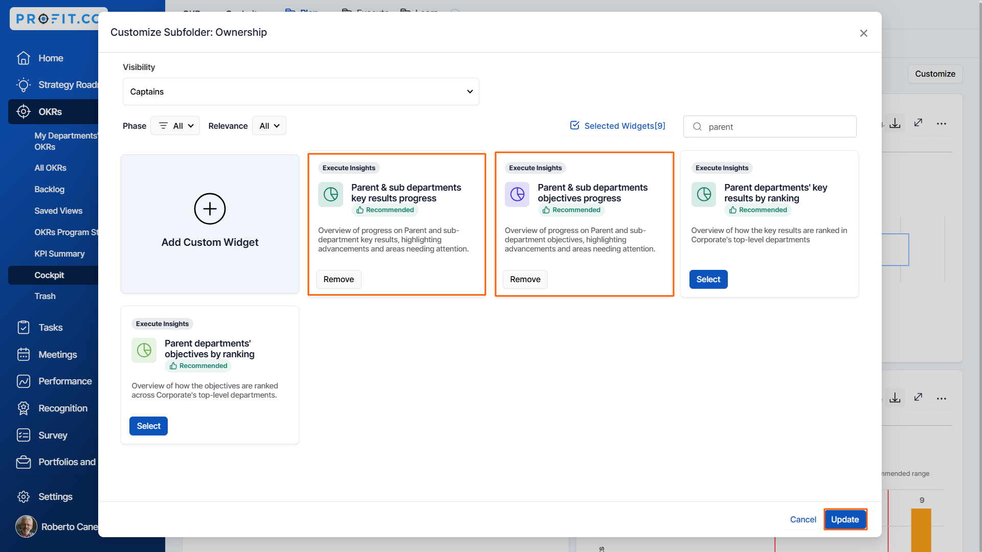 On the Customize page, select the “Parent & sub departments key results progress” & “Parent & sub departments objective progress” widgets and click Update.