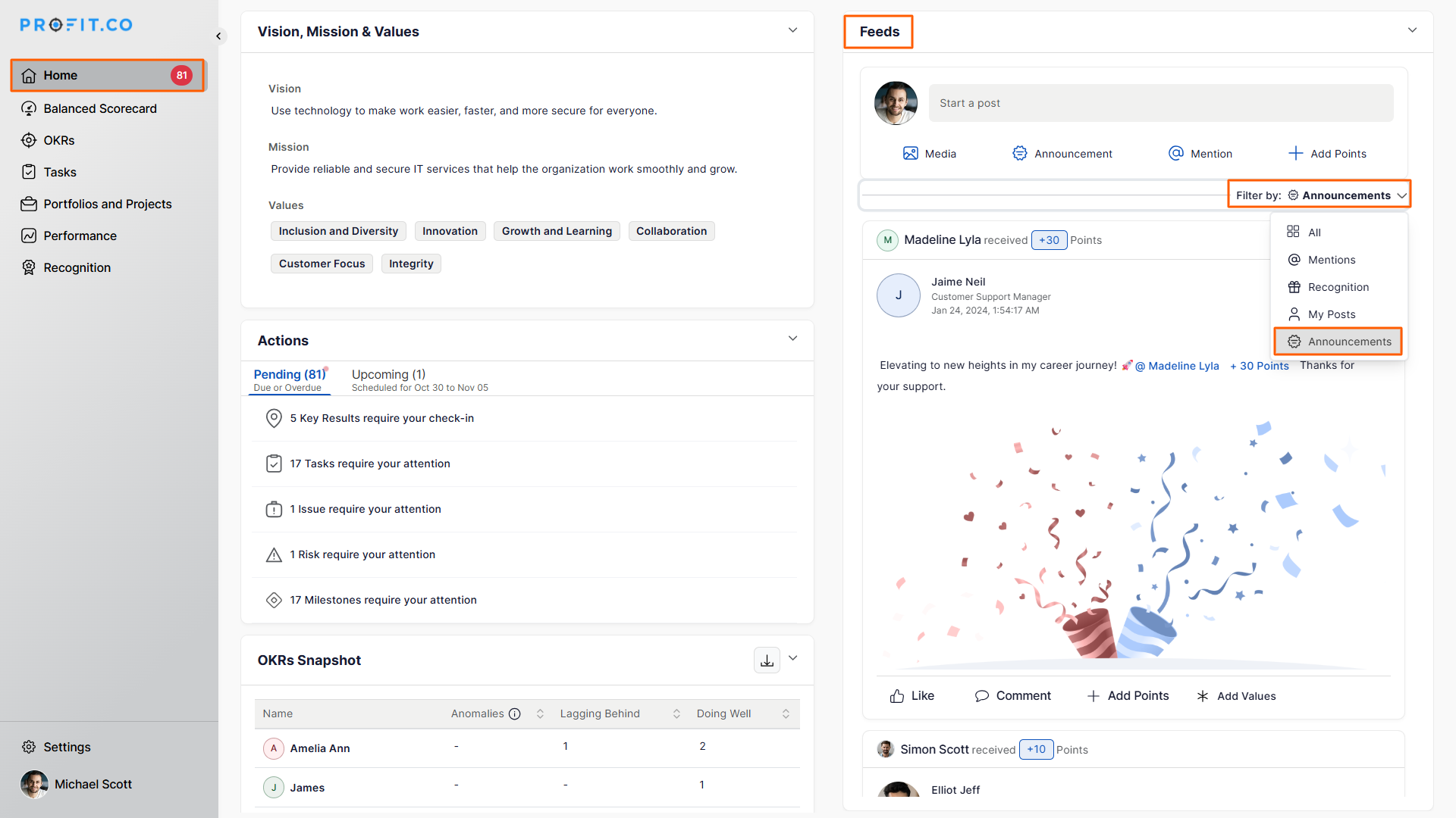 When an employee’s work anniversary arrives, Profit.co automatically publishes a recognition post and sends notifications to relevant users.