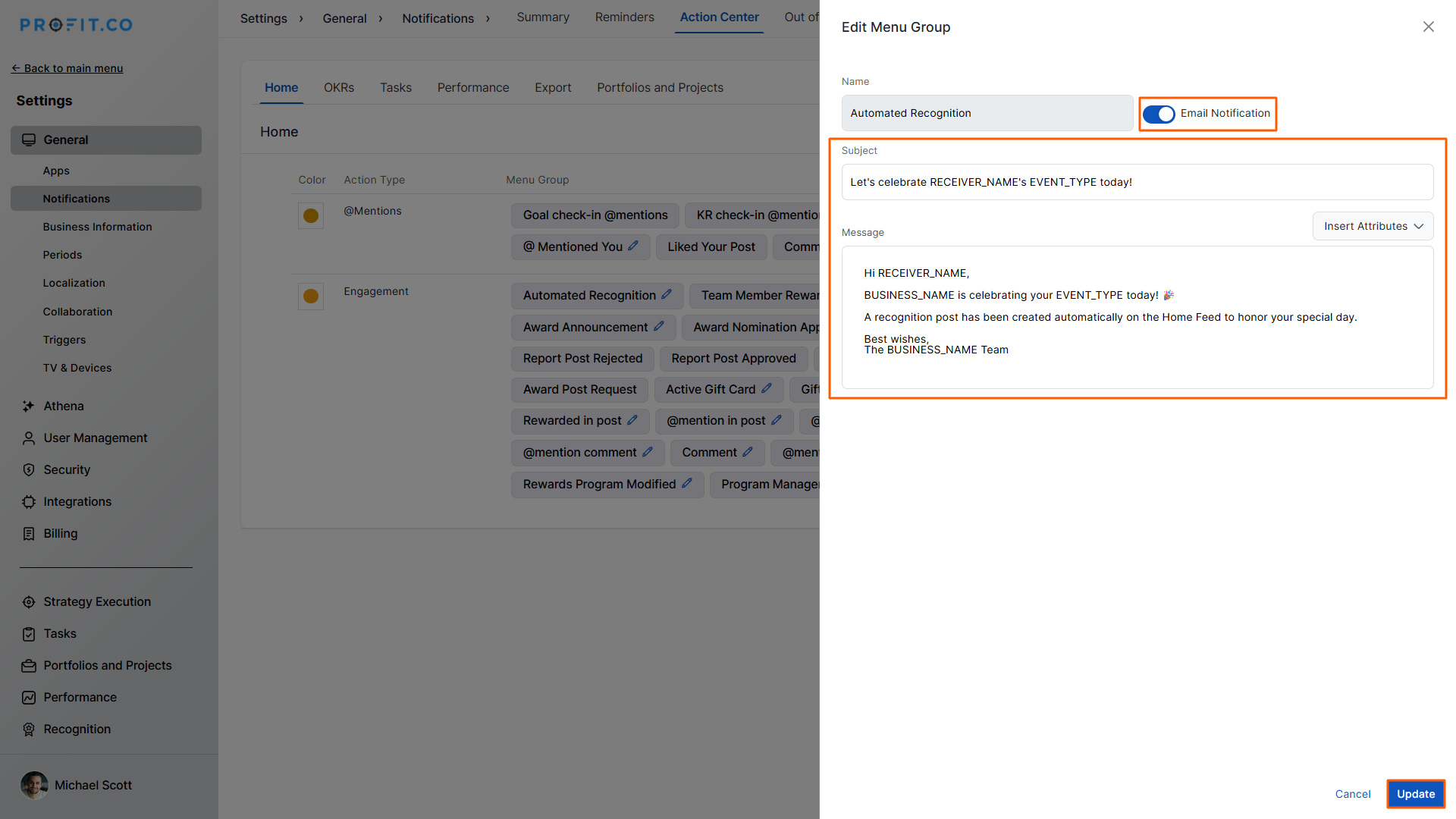 Profit.co sends both in-app and email notifications when an automated recognition post goes live.