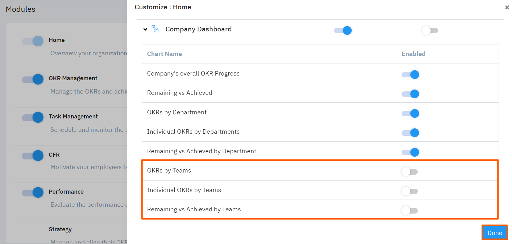 For instance, if the organization uses only departments you can customize the Company Dashboard by disabling the toggles that show the chart related to Teams.