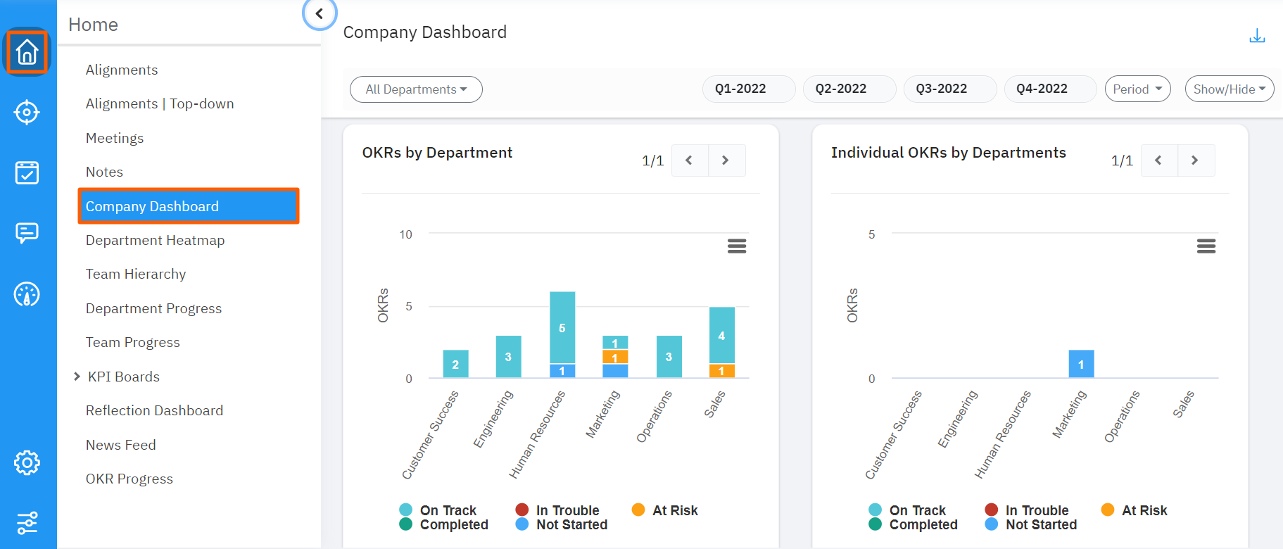 If you navigate to the Company dashboard from the left menu you will be able to see all other charts excluding team OKR charts.