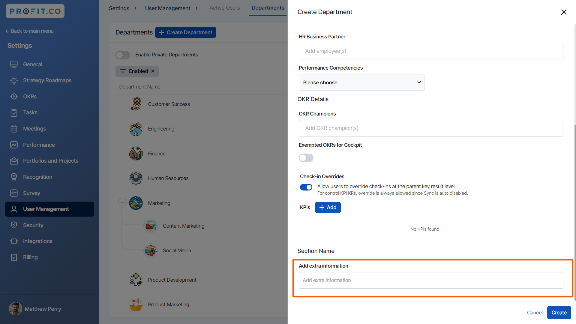 Profit.co provides an option to set custom attributes while creating/editing Departments.