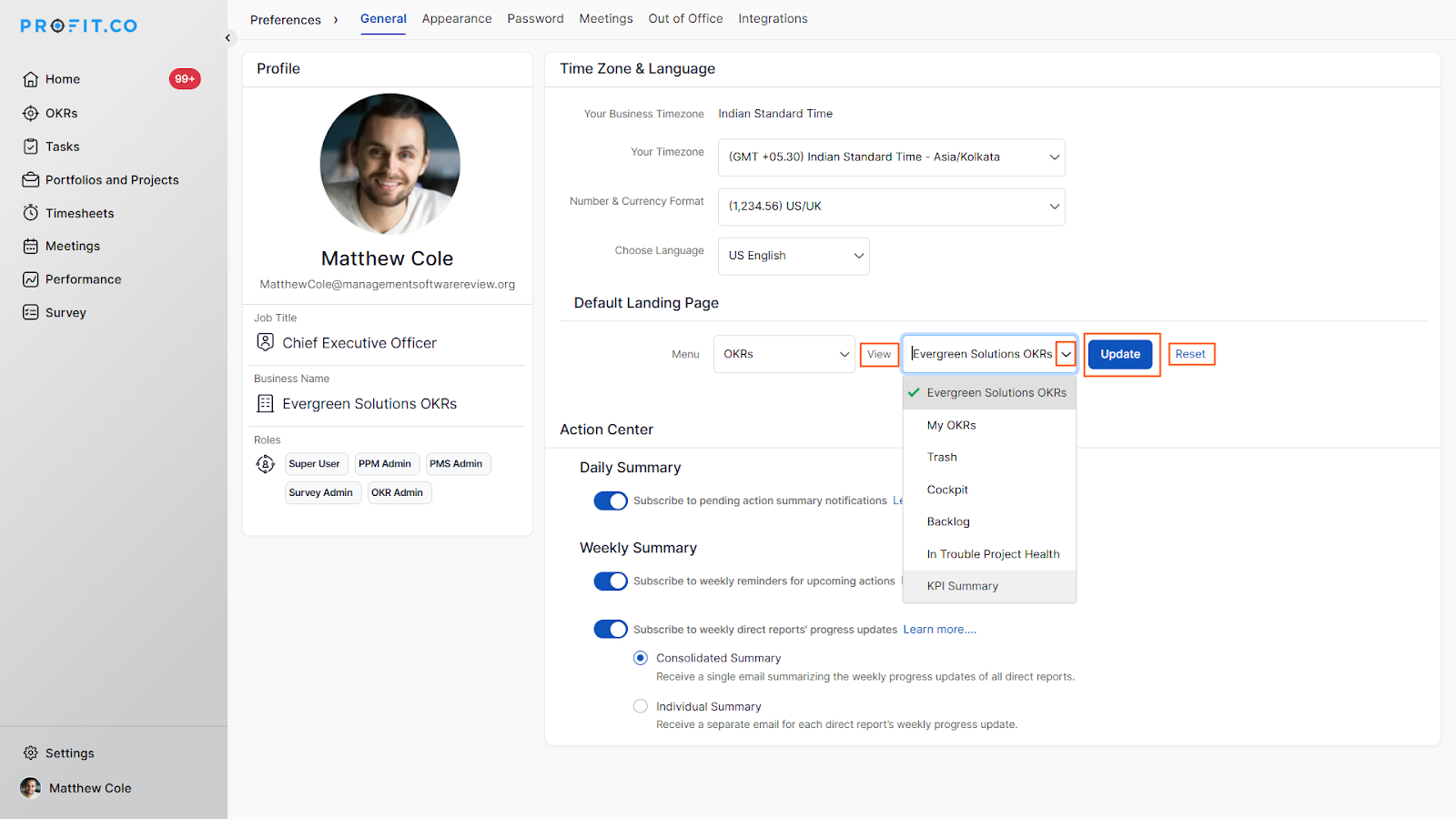Profit.co allows users to set a default landing page so they are taken directly to their most-used section every time they log in. Users with department or sub-department access can configure their landing page to reflect their specific position within the organizational hierarchy.
