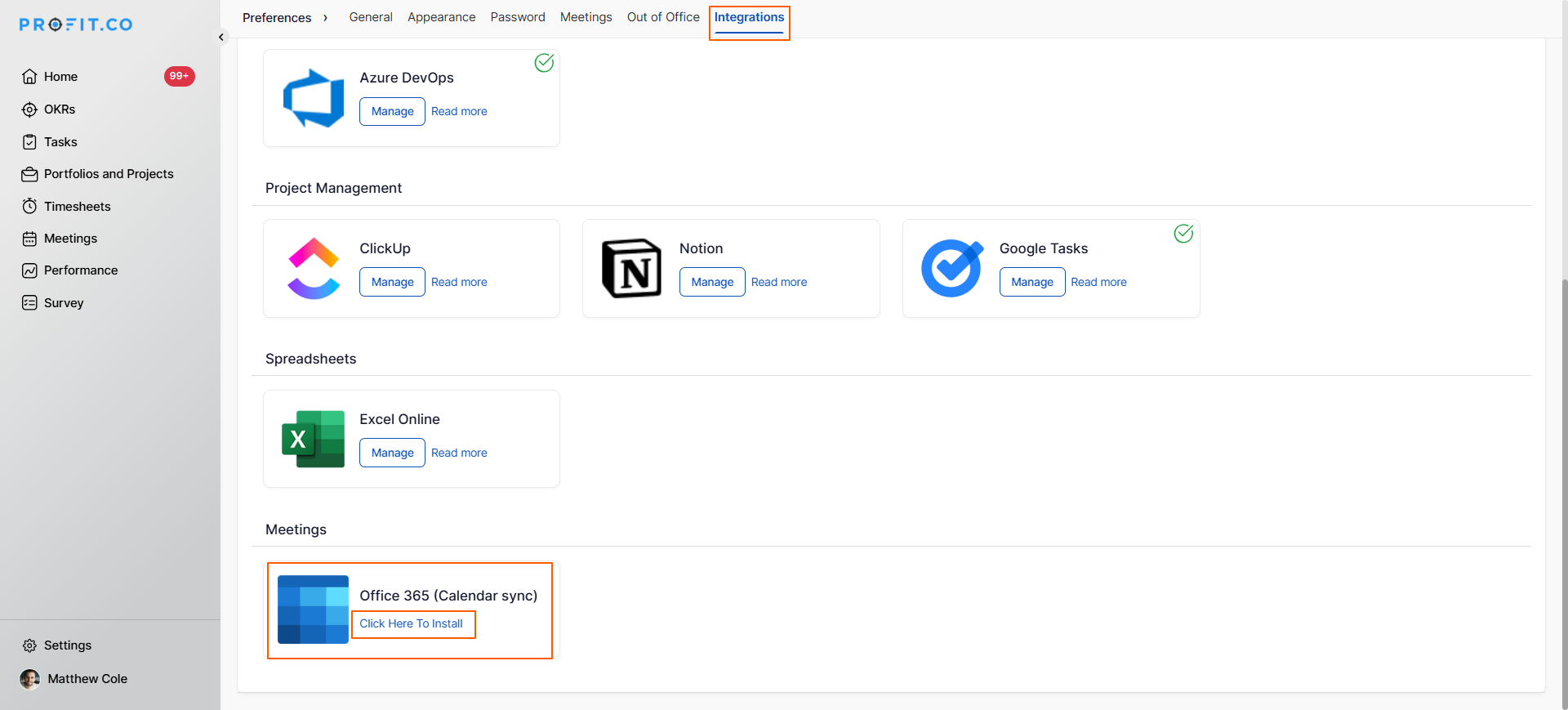 Profit.co provides a built-in Office 365 integration that allows you to seamlessly sync your meetings between Profit.co and your Office 365 Calendar.