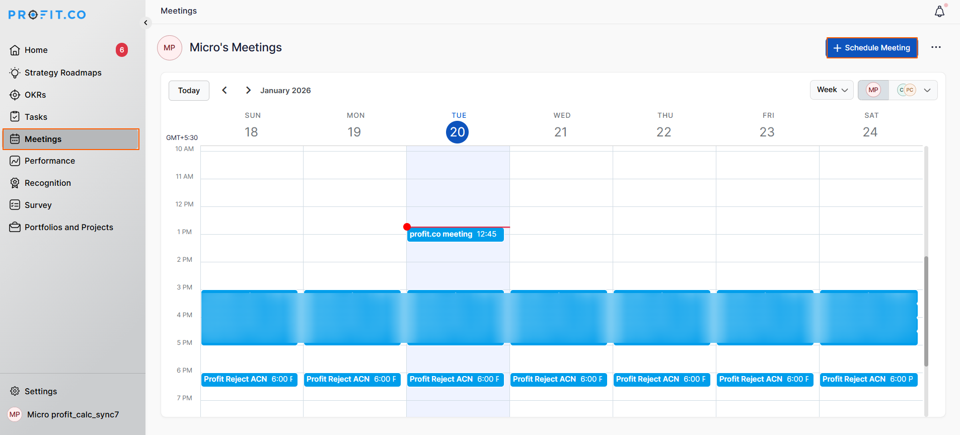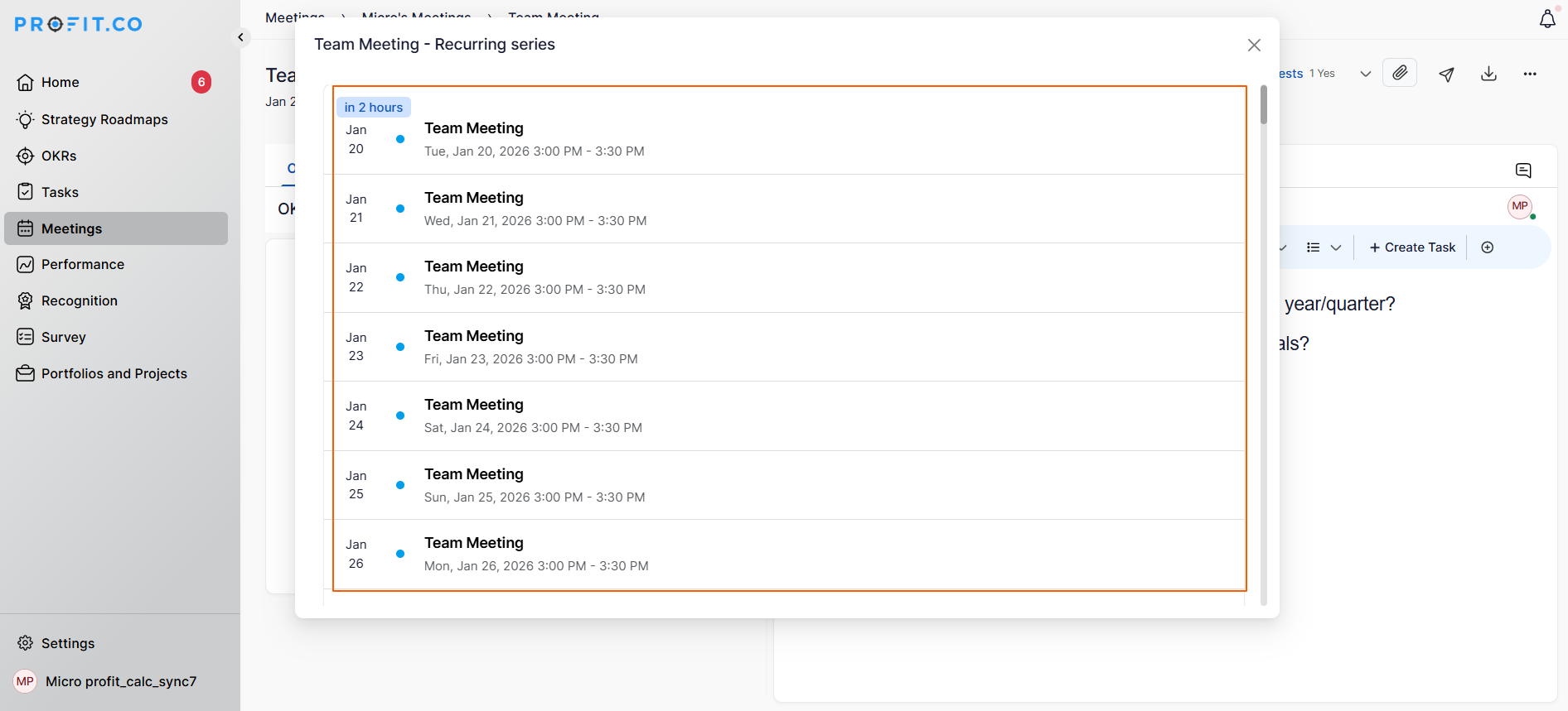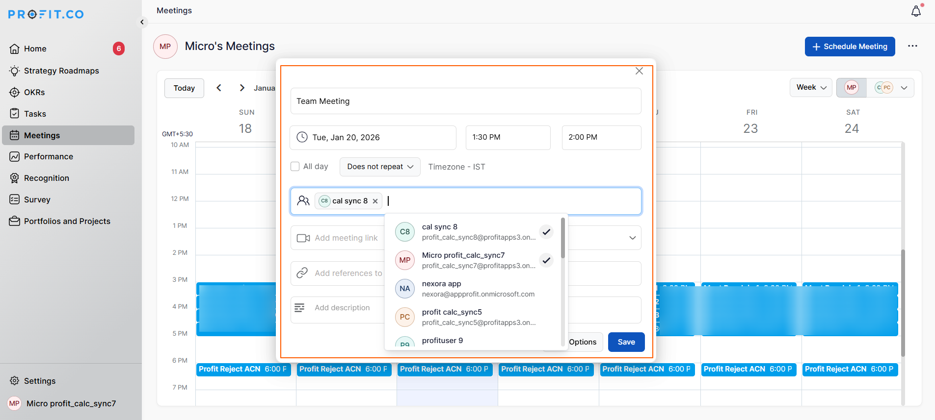 Likewise, meetings created in Office 365 Calendar will automatically reflect in the user’s Profit.co account