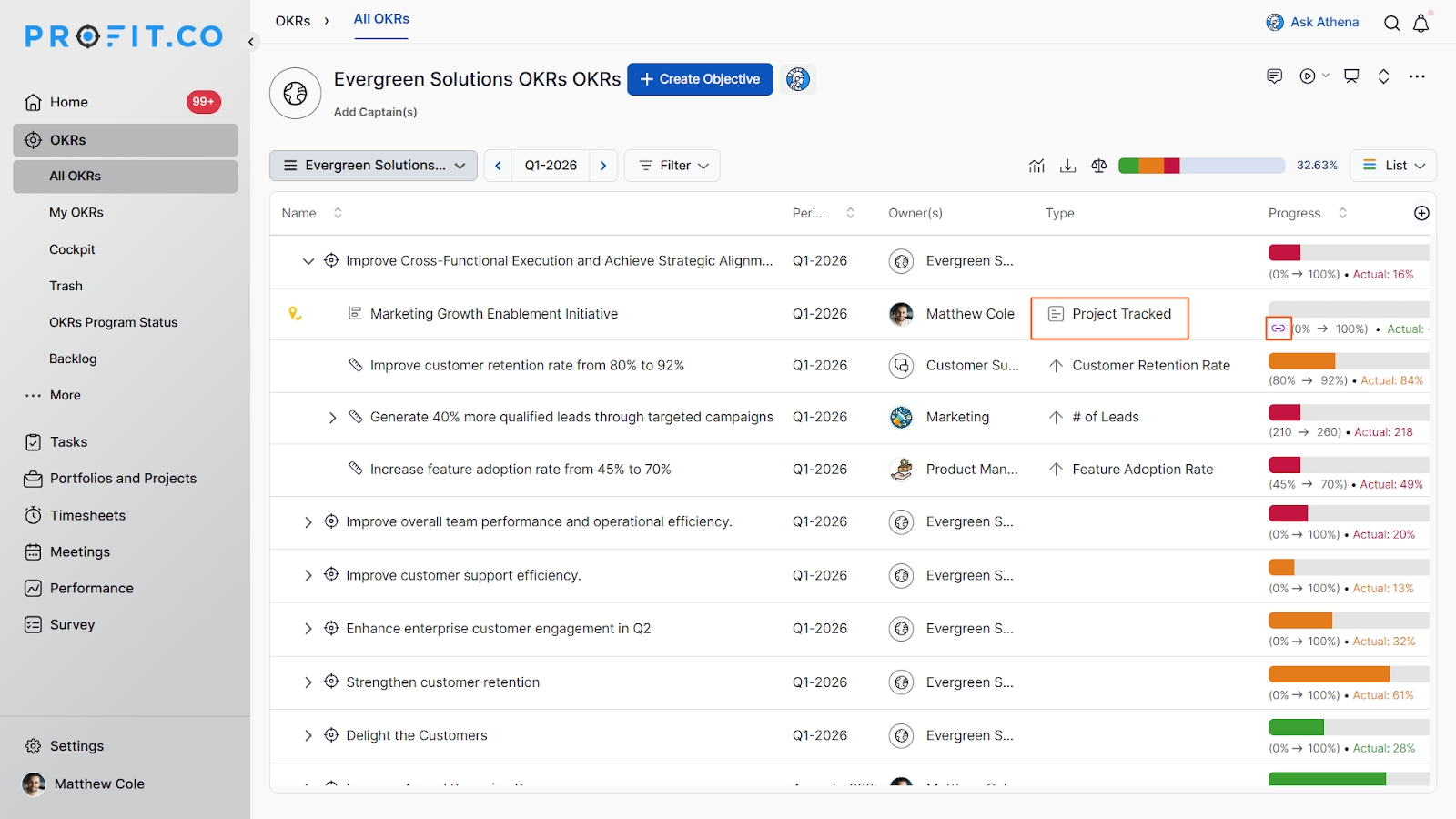 In Profit.co, you can create a Key Result of type Project Tracked, linking it directly to an existing project or milestone so that project progress automatically drives Key Result progress — no manual check-ins required.