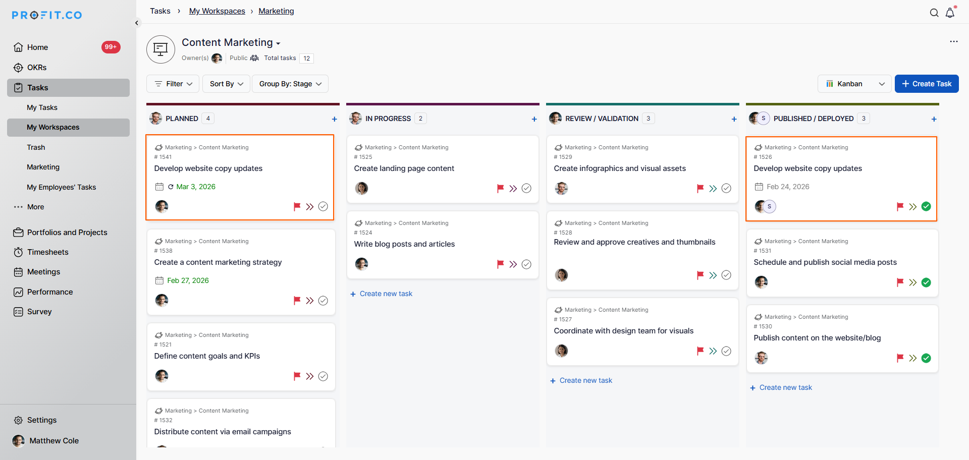 When a recurring task is moved to the Completed status, Profit.co automatically re-creates the same task with the status Not Started for the next cycle.