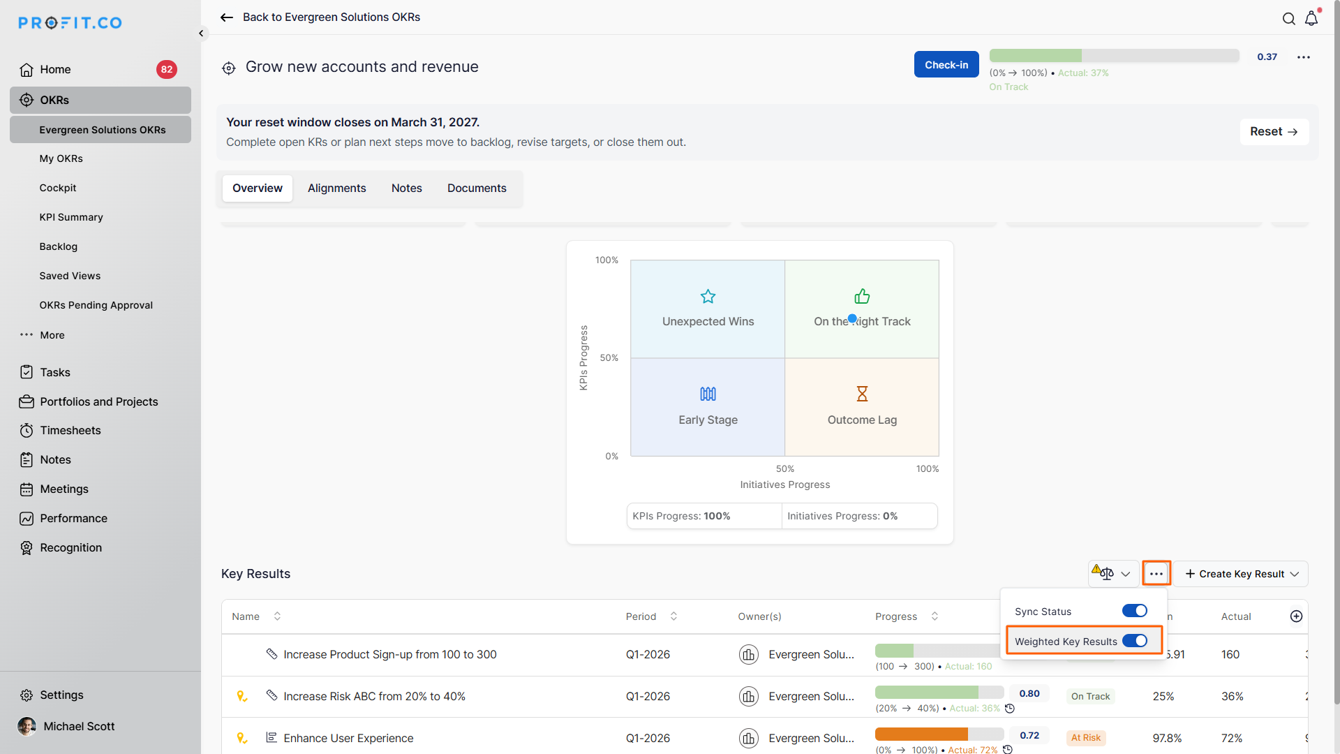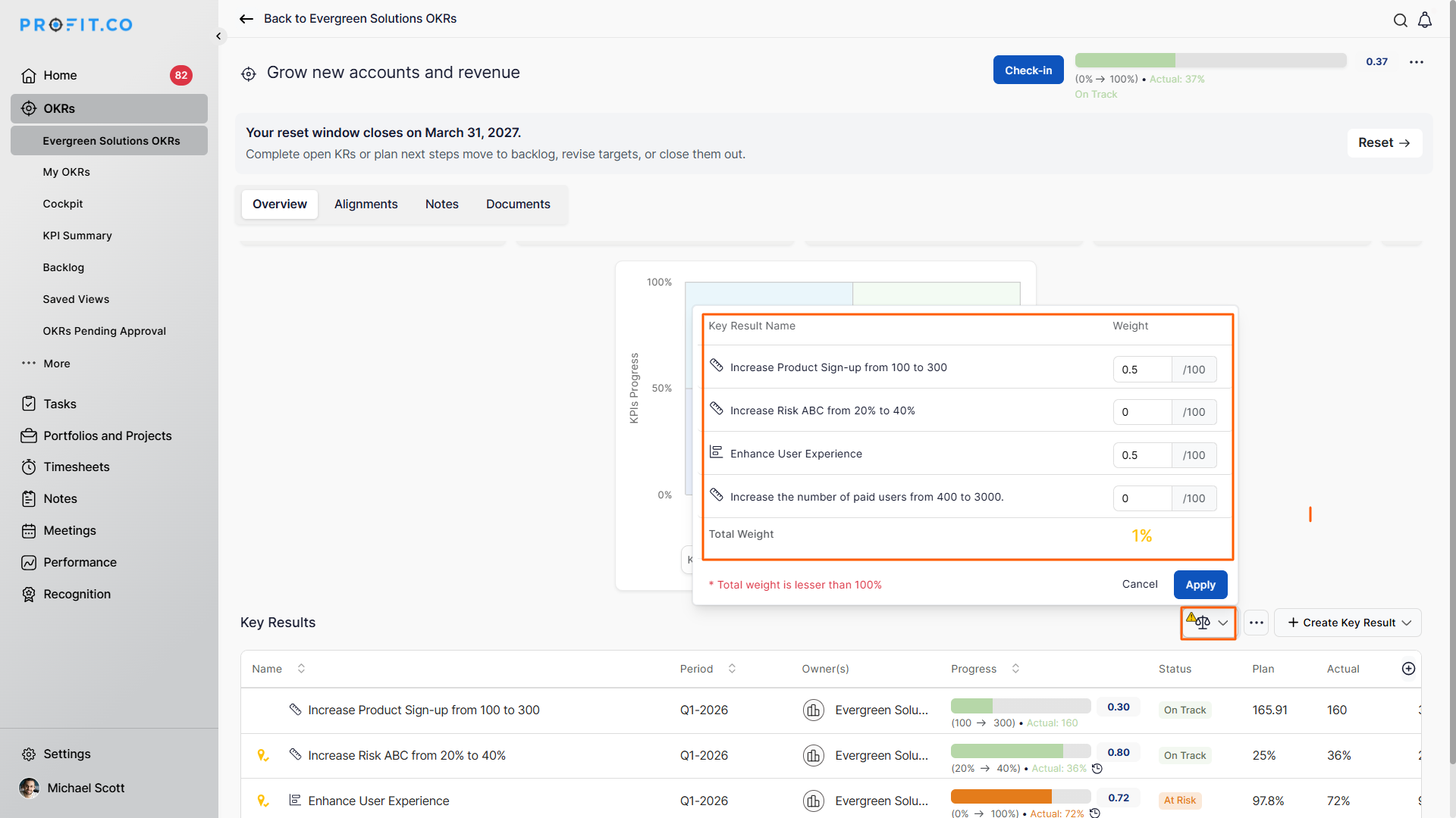 Profit.co allows you to assign weights to key results under an objective, helping you reflect the relative importance of each key result. OKR progress is calculated based on these weights, giving a more accurate view of objective performance.