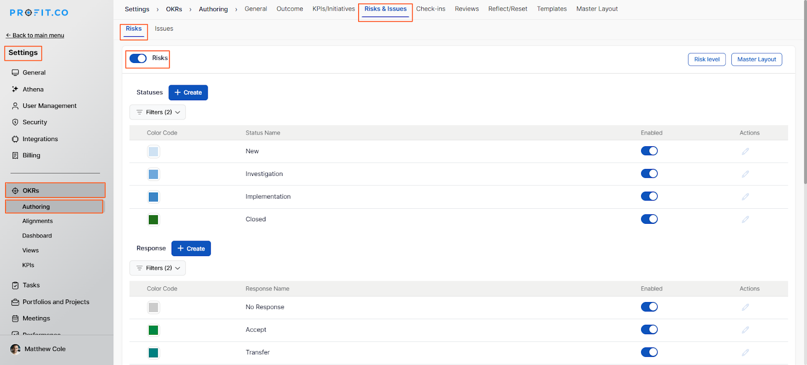 - Enable both Risk and Issue Management features to maintain comprehensive oversight of your OKRs.