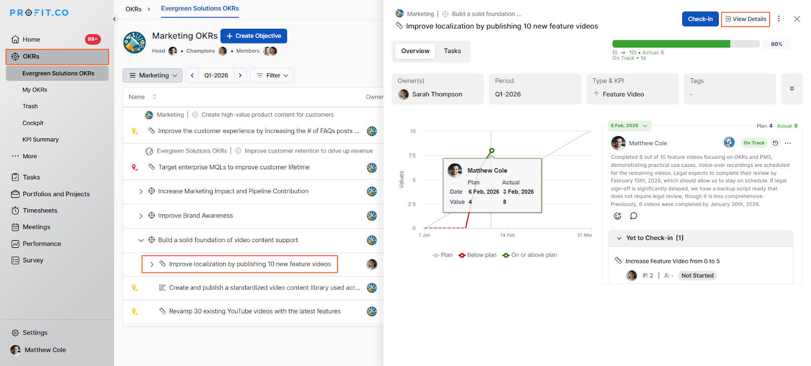 Profi.co allows you to report your progress on your key results at different OKR levels. Why are key result check-ins ...Read more