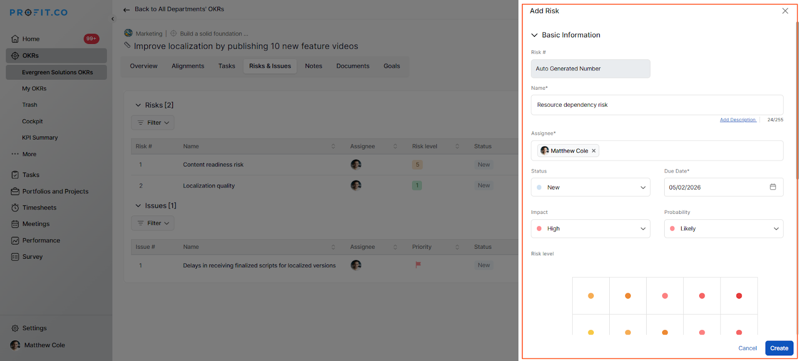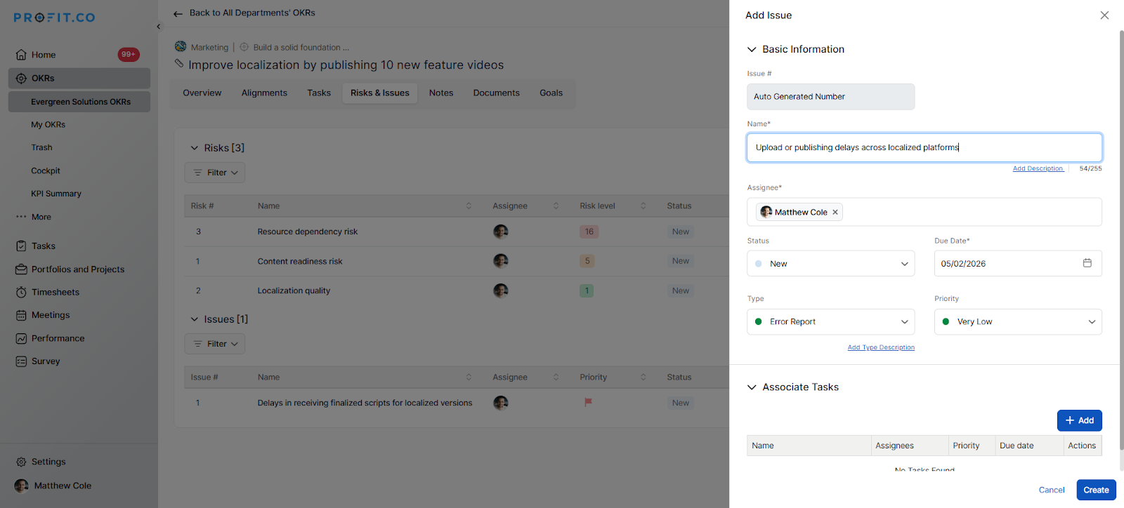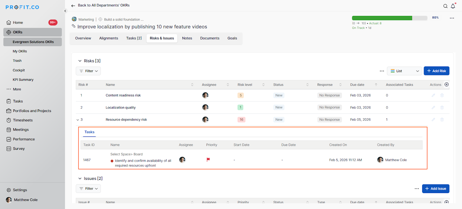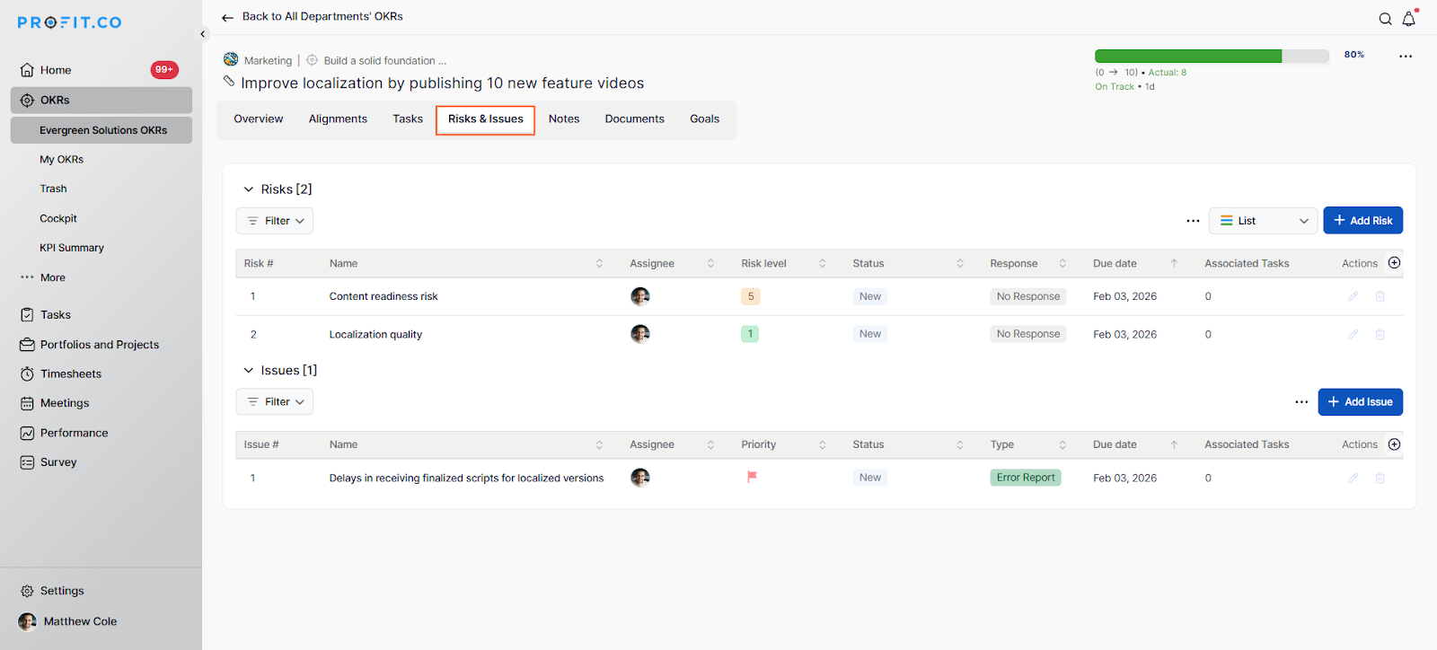 In Profit.co, you can enable Risks & Issues Management at the Key Result level to proactively identify potential problems and track existing challenges that may impact your objectives