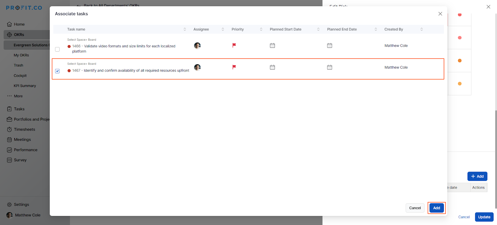 - Choose the Objective or Key Result where you want to add Risks. (In this example, let’s see how to add risks at the KR level.)