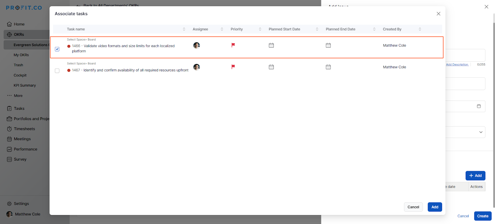 Note: To associate tasks with issues, select the relevant tasks. Tasks associated with issues are used for resolution purposes, helping to address and resolve the problem after it has occurred.