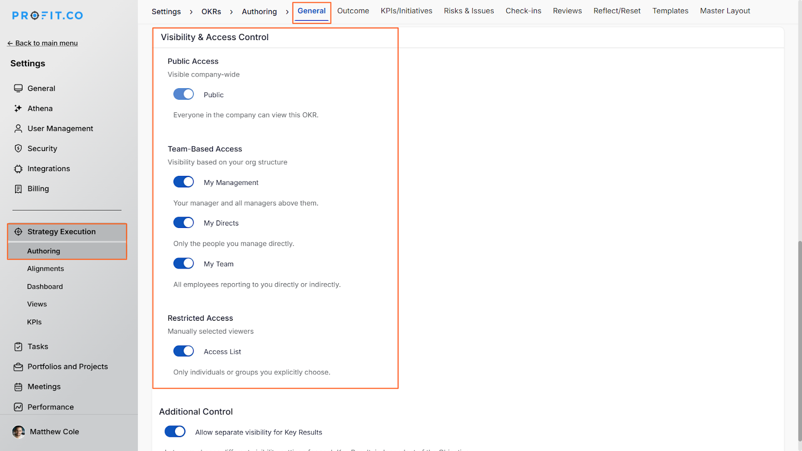Profit.co's visibility and access control feature enables organizations to manage the transparency of department, team, and individual OKRs. You can choose from five visibility levels (Public, My Management, My Directs, My Team, and Access List) to ensure that the right people have access to the right information at the right time.