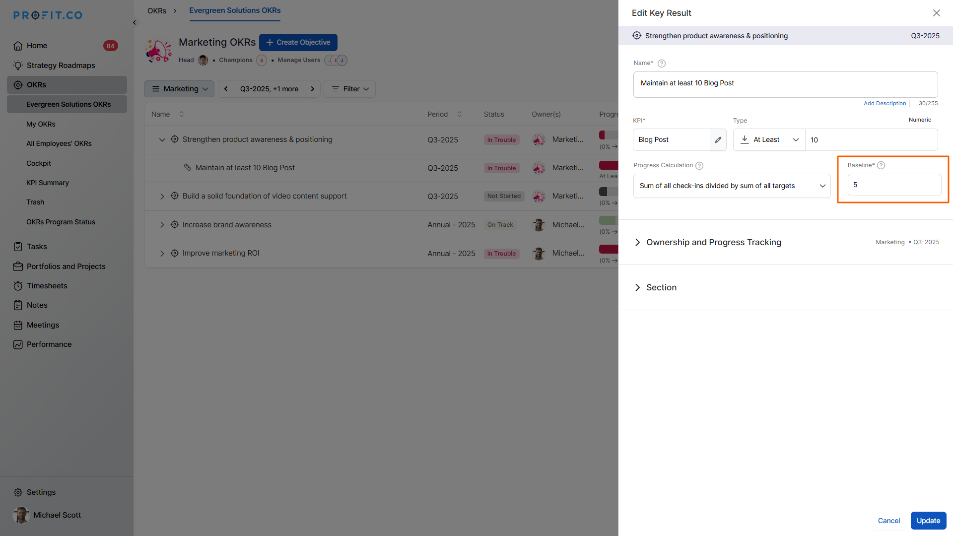 Profit.co now provides a Baseline option in Control KPIs to ensure progress tracking starts from the true initial value of your metric, not zero. This makes KPI evaluation more accurate, fair, and reflective of the actual effort delivered during the goal cycle.