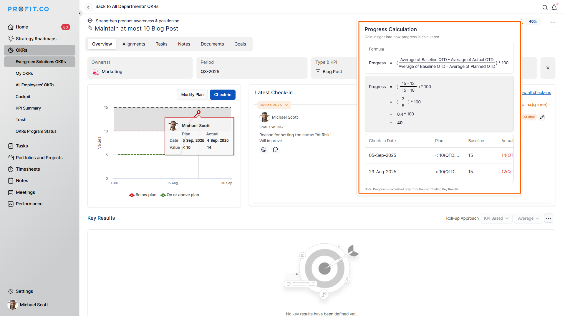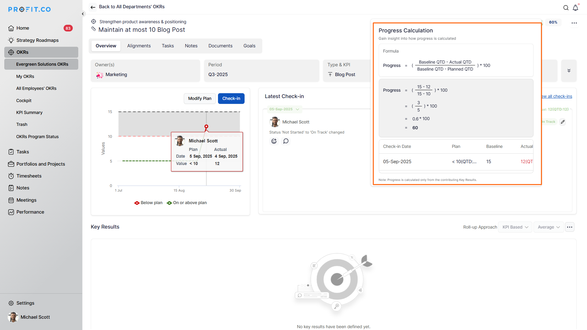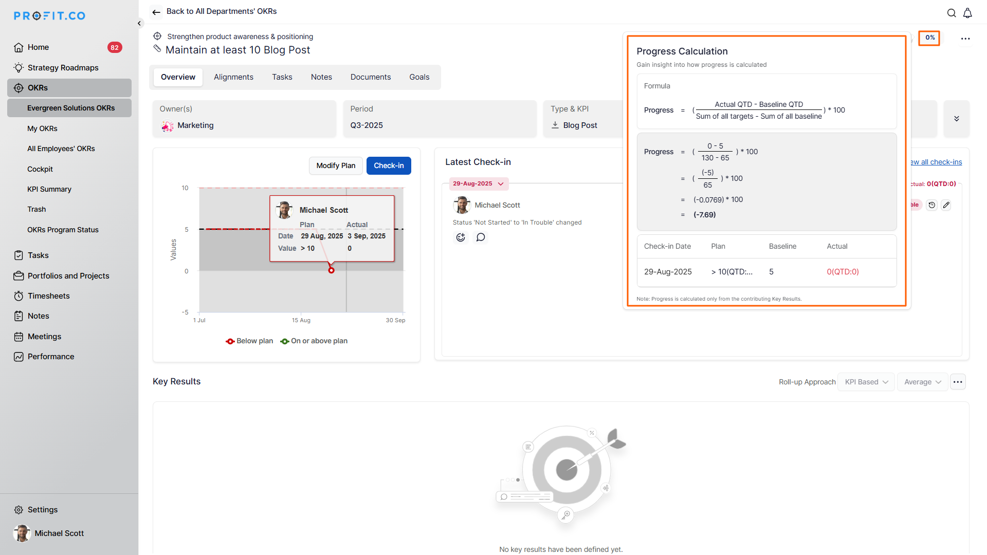 Note: If a check-in is made with 0 progress, the value calculation will show a minus, but the progress will still display as 0%