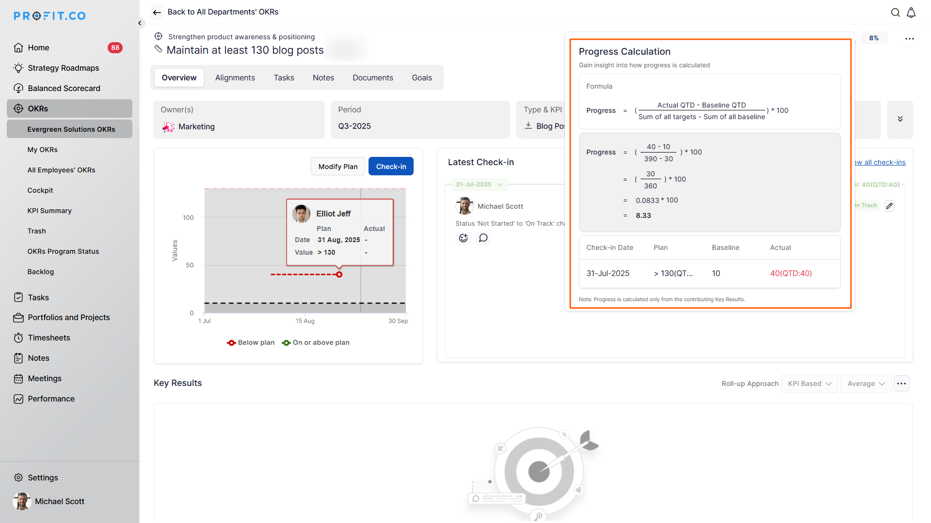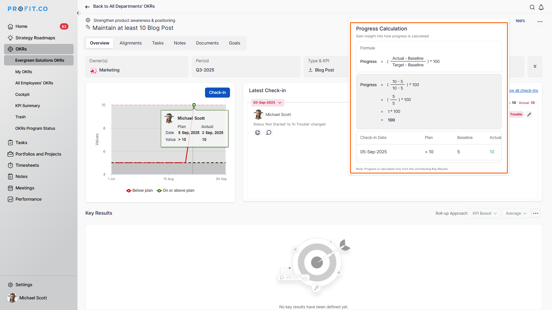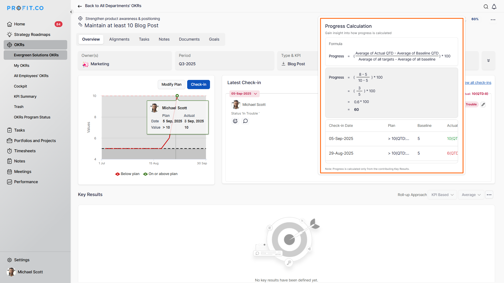 Note: If a check-in is made with 0 progress, the value calculation will show a minus, but the progress will still display as 0%