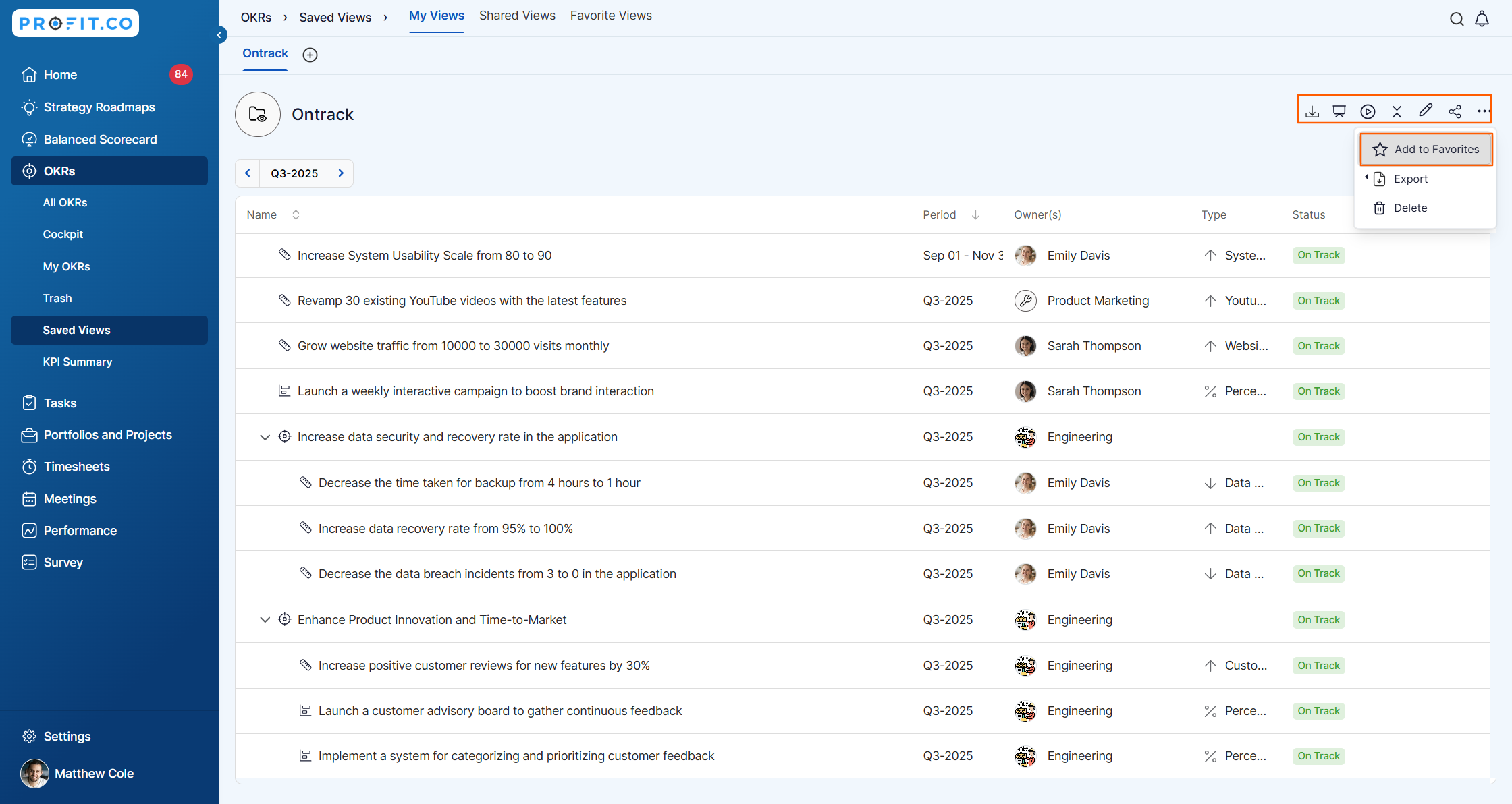 The Saved View in Profit.co allows you to quickly access custom-filtered OKR views without setting filters each time.