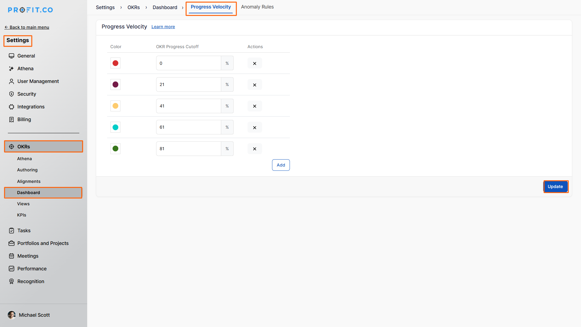 - Update the Color settings and OKR Progress Cut-Off ranges