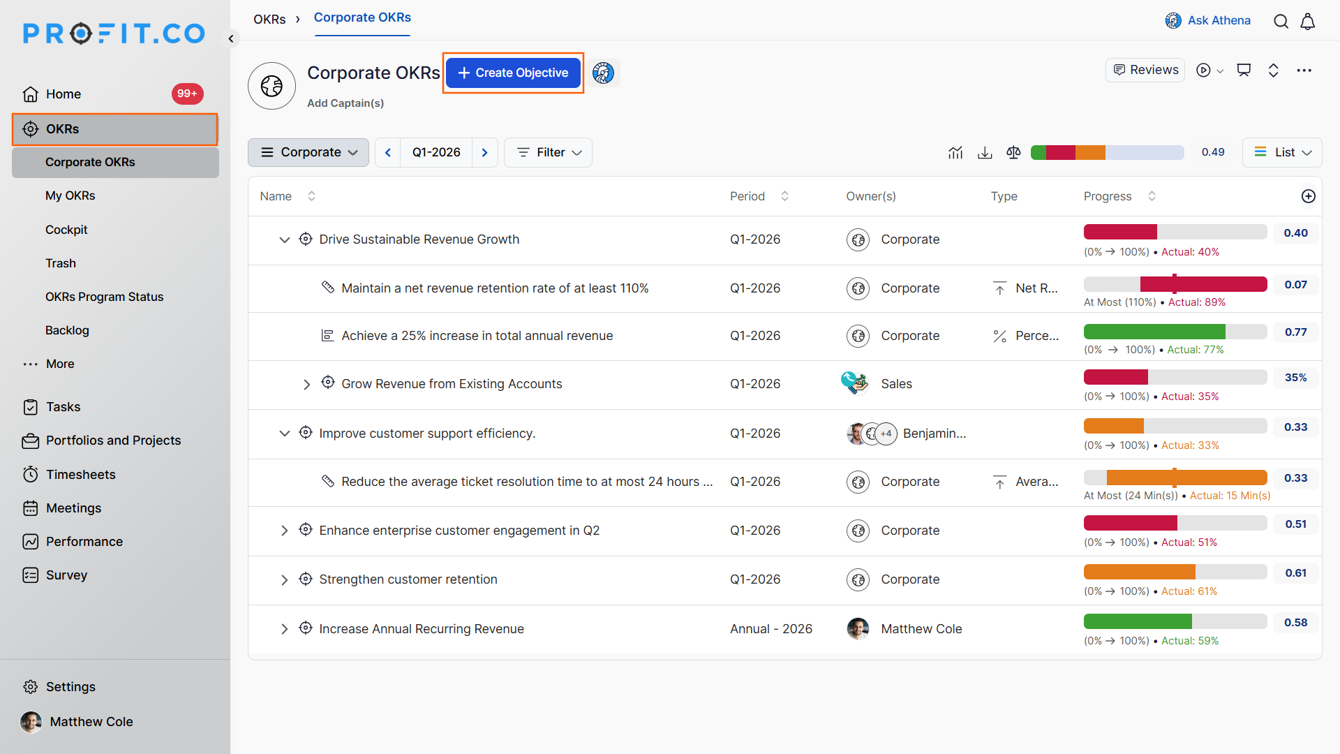 In Profit.co, users can create Objectives directly from the OKRs module using a quick-form panel, with support for multiple owners to accurately reflect shared accountability across teams.