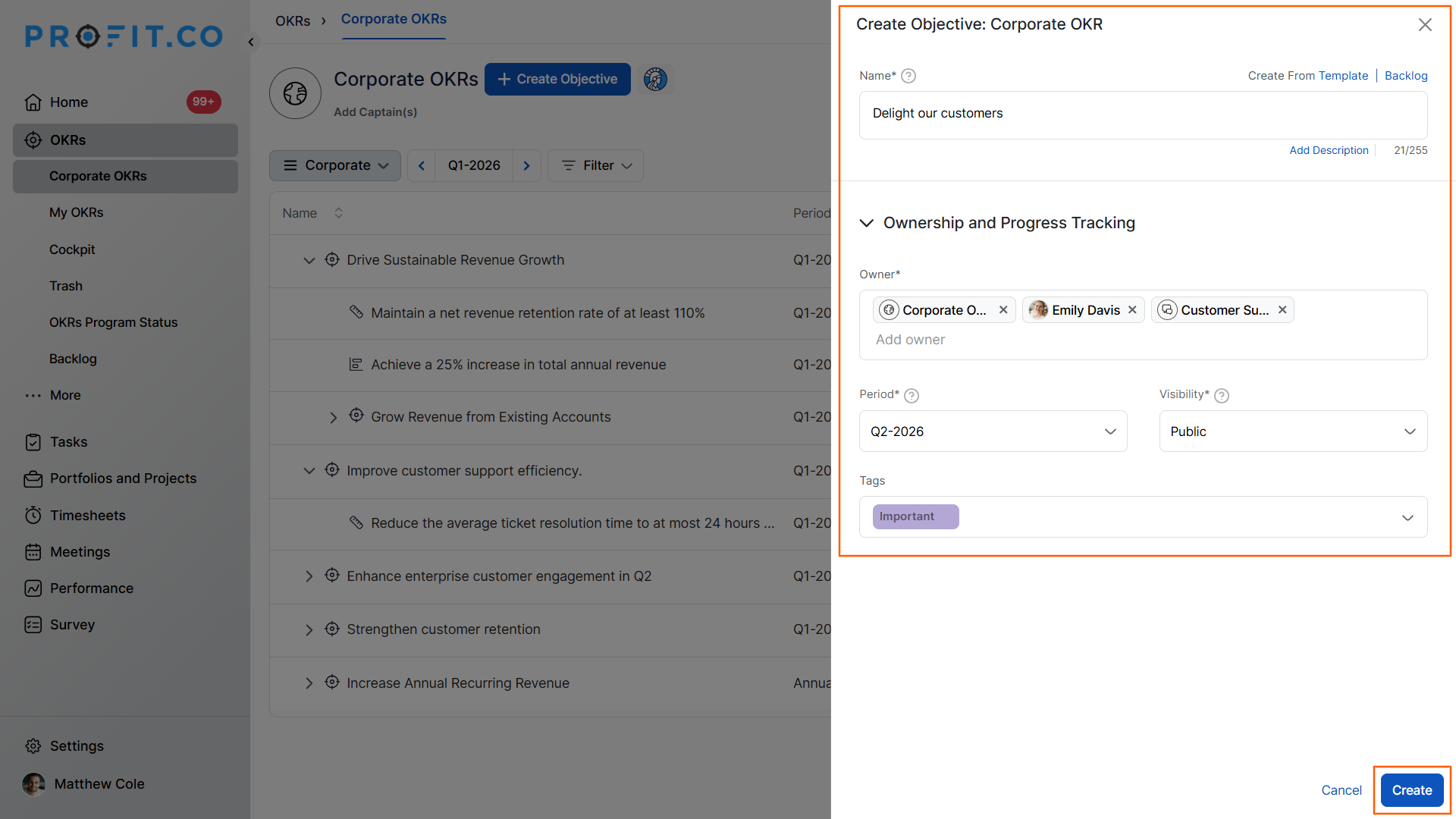 Creating Objectives in Profit.co ties individual and team efforts to organizational strategy. When Objectives are properly configured with owners, visibility, and tags, teams operate with clear accountability and focused priorities.