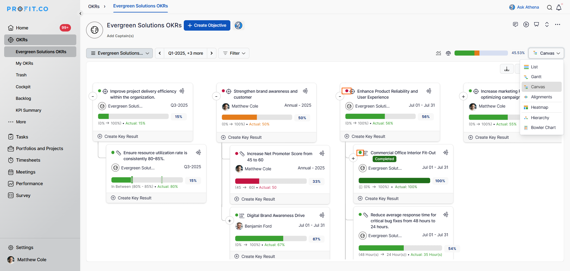 Profit.co provides an option to view all your OKRs in a Canvas view — displaying them in a simplified architectural layout for easier navigation and reorganization.