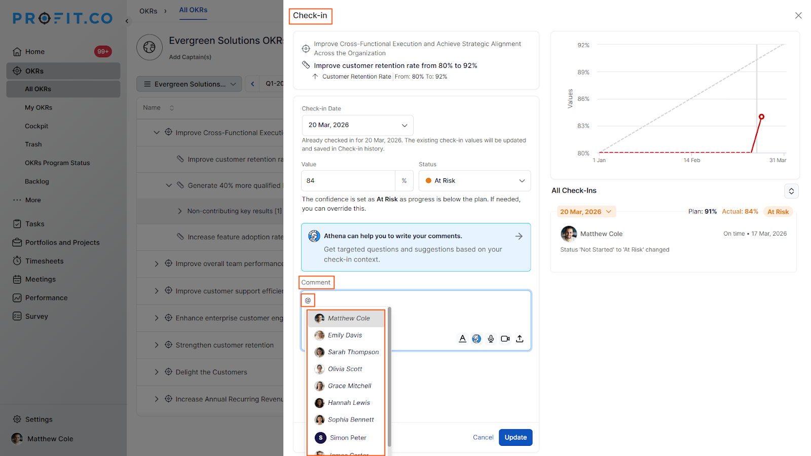 Profit.co supports @ mentions in two key locations within the OKR module - Notes and Check-in Comments. Typing @ in either area surfaces a user list, and the tagged person receives a direct notification to take action.