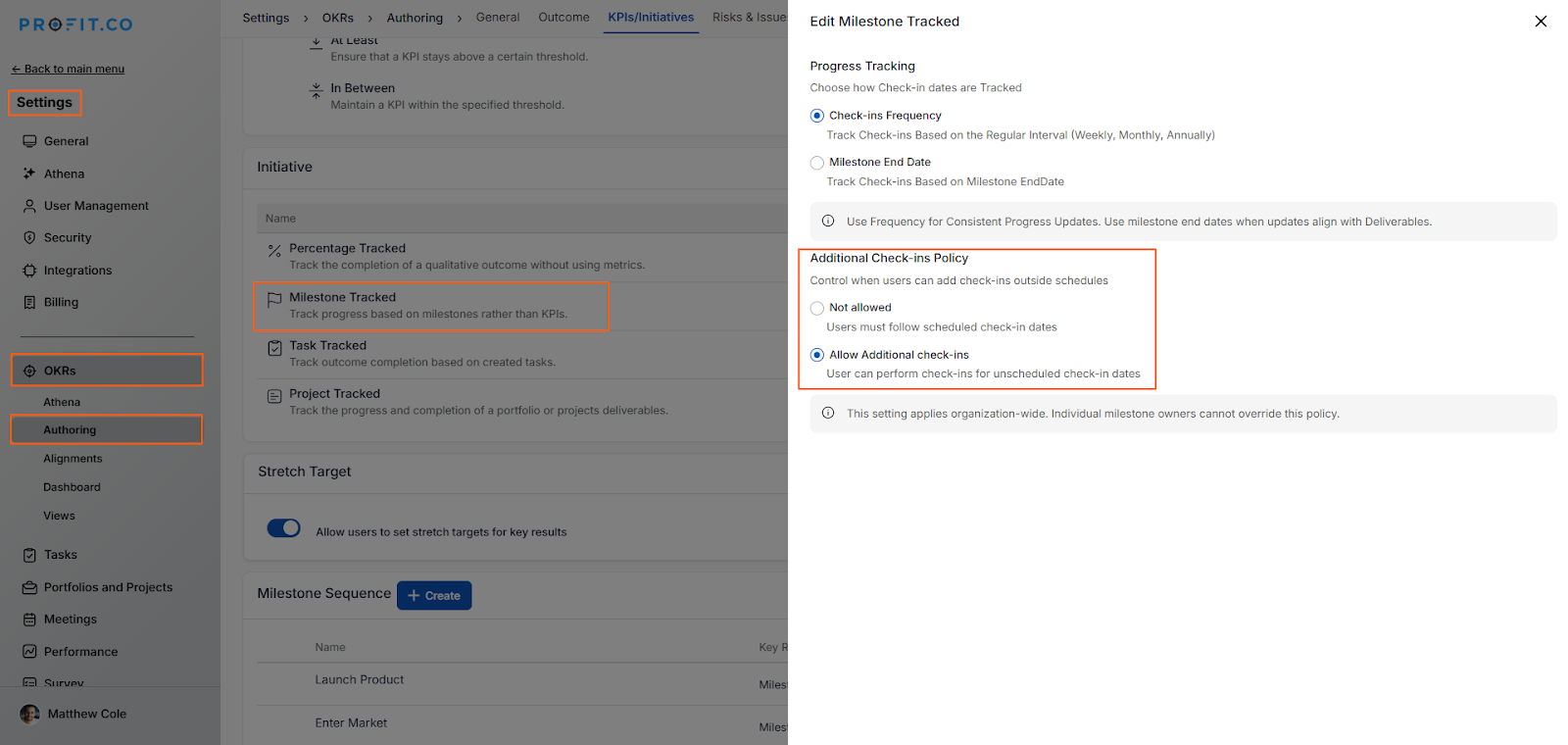 - Navigate to Settings → OKRs → Authoring → KPIs/Initiatives → Edit Milestone Tracked.