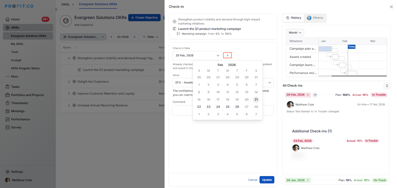 By default, Milestone Tracked Key Results follow a scheduled check-in cadence. Profit.co also allows admins to enable Additional Check-ins — letting users log progress on a Milestone KR at any point between scheduled check-in dates, without waiting for the next scheduled window.