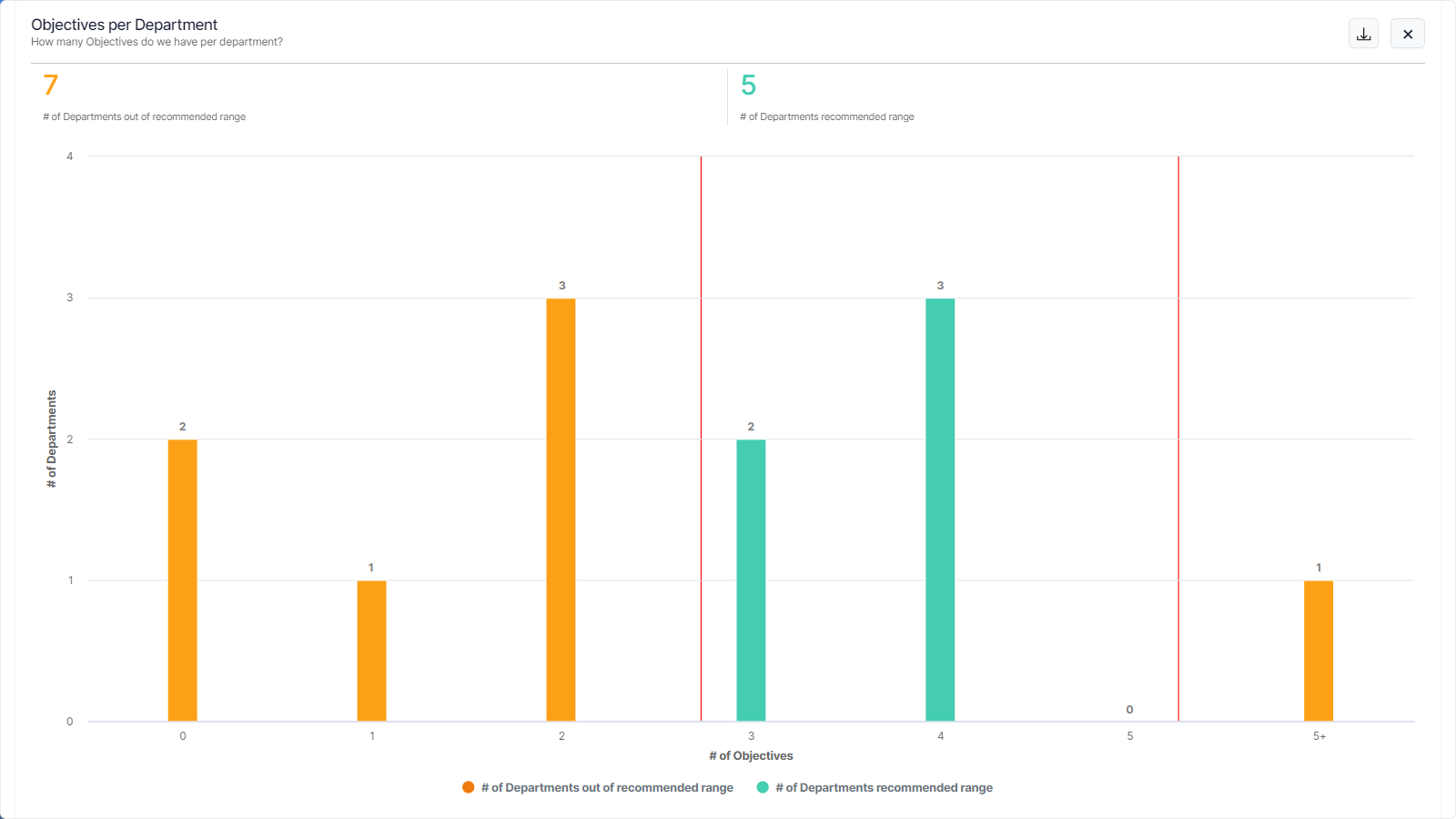 The "Departments Within and Outside Recommended Objective Range" feature displays departments with 3-5 objectives in green, and those with fewer than 3 or more than 5 objectives in yellow, indicating alignment with the recommended range.