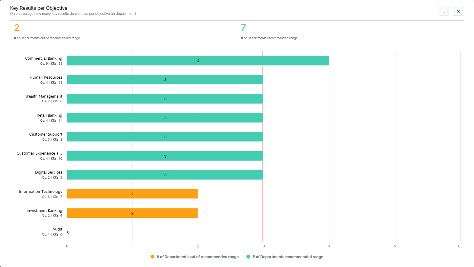 The "Key Results per Objective" feature shows the average Key Results per objective per department, yellow for those outside the recommended range and green for those within the recommended range.