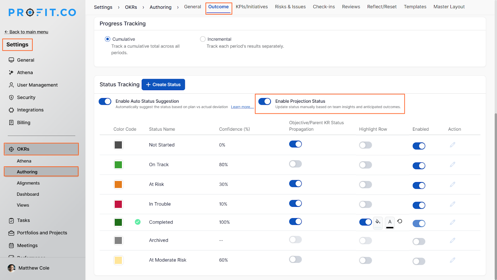 - Enable Projection Status before the OKR cycle begins, navigate to Settings → OKRs → Authoring → Outcomes tab, and turn on the Projection Status toggle so the field appears in all check-ins from day one.