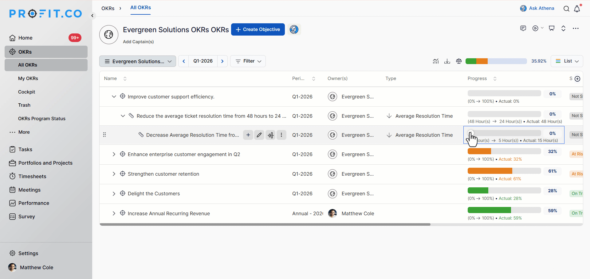 In Profit.co, users can create Objectives directly from the OKRs module using a quick-form panel, with support for ...Read more