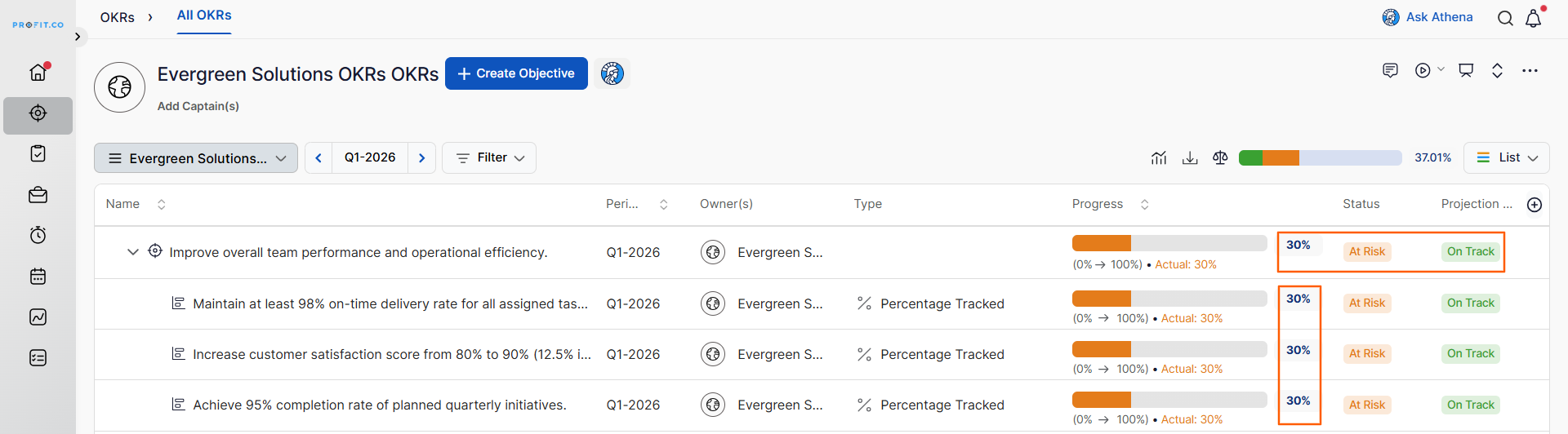 Profit.co automatically rolls up projection statuses from Sub Key Results to their parent Key Results and Objectives, giving leaders a real-time read on Objective health without waiting for manual status updates at each level.