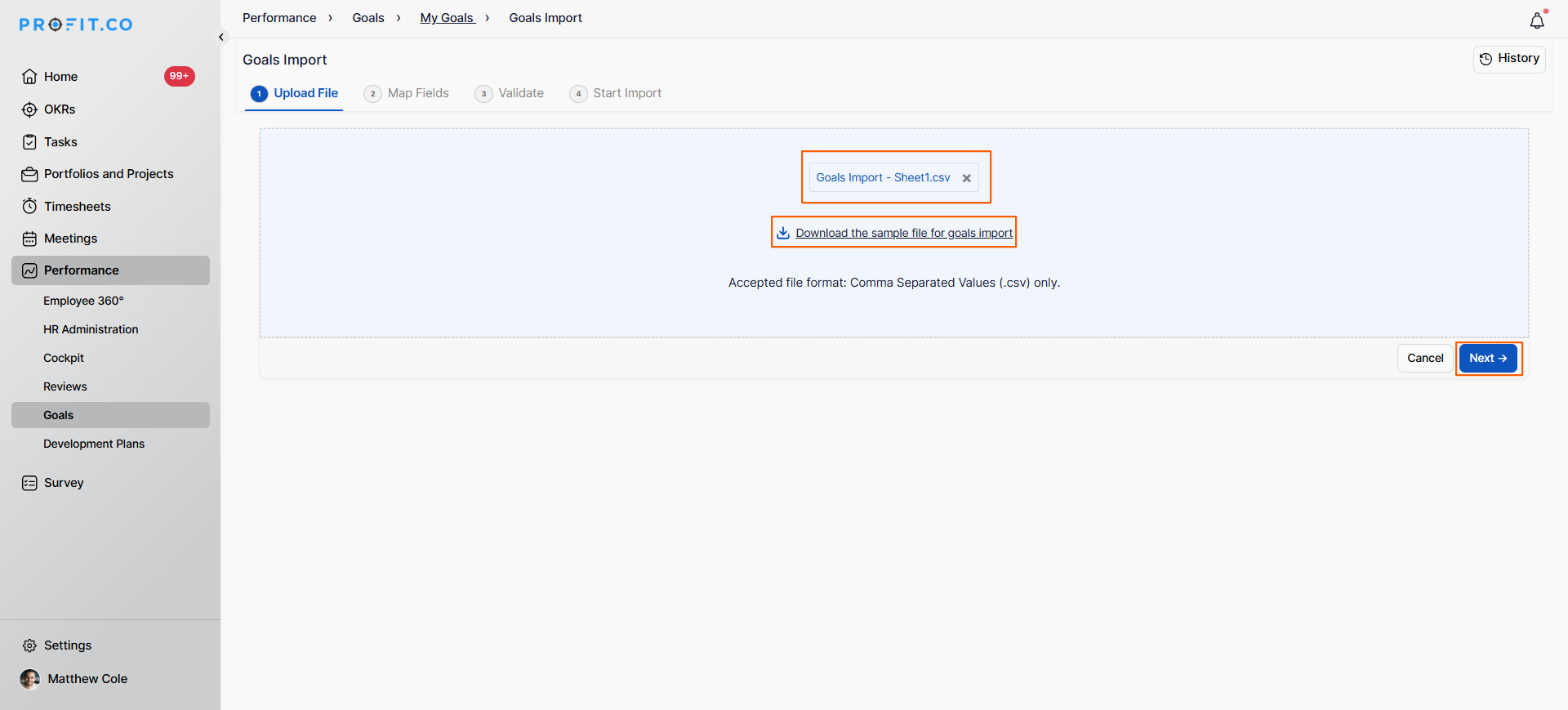 Only the Comma-Separated Value (.csv) format is accepted for goals import. Other file formats like Excel (.xlsx), text (.txt), or PDF (.pdf) are not supported and will be rejected during upload.