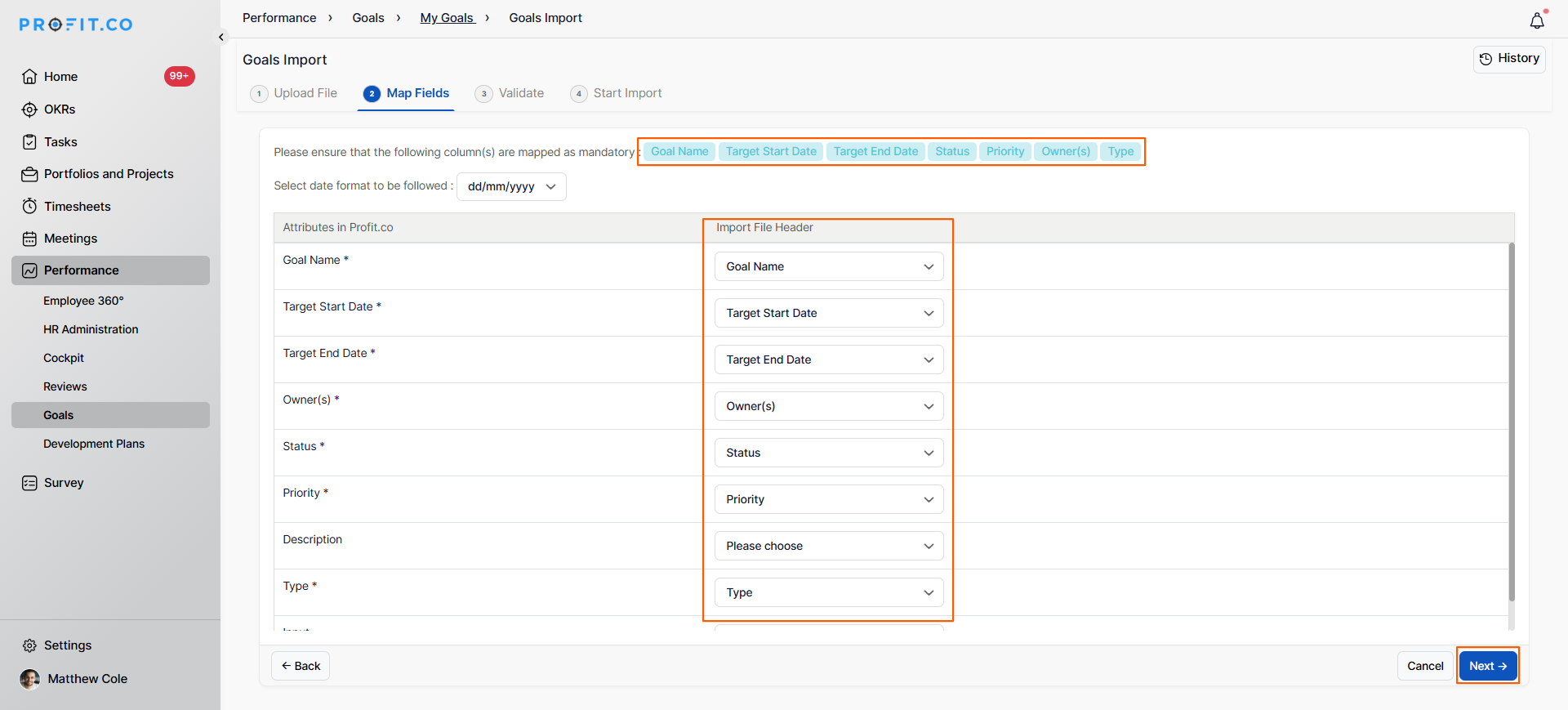 - Review the imported goals immediately after import to ensure all data appears correctly in the system.