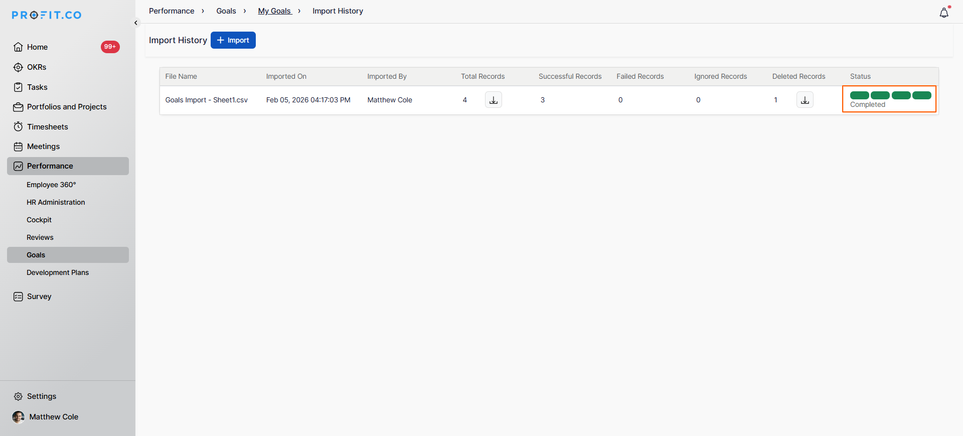 The Import Goals feature allows you to bulk upload multiple goals from a CSV file instead of creating them one by one. This saves time when setting up goals for multiple team members or when migrating goals from another system.