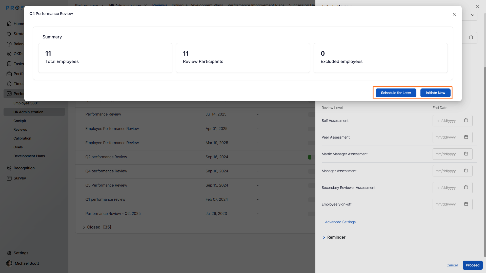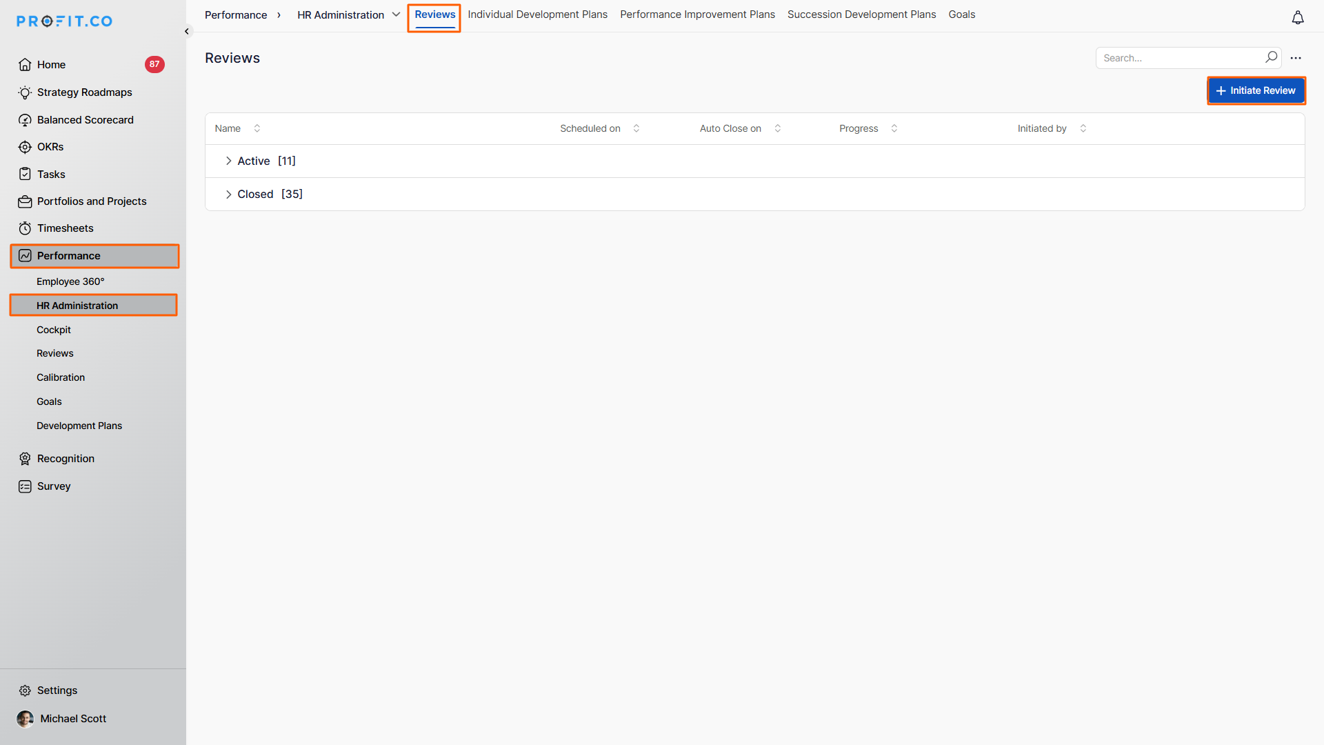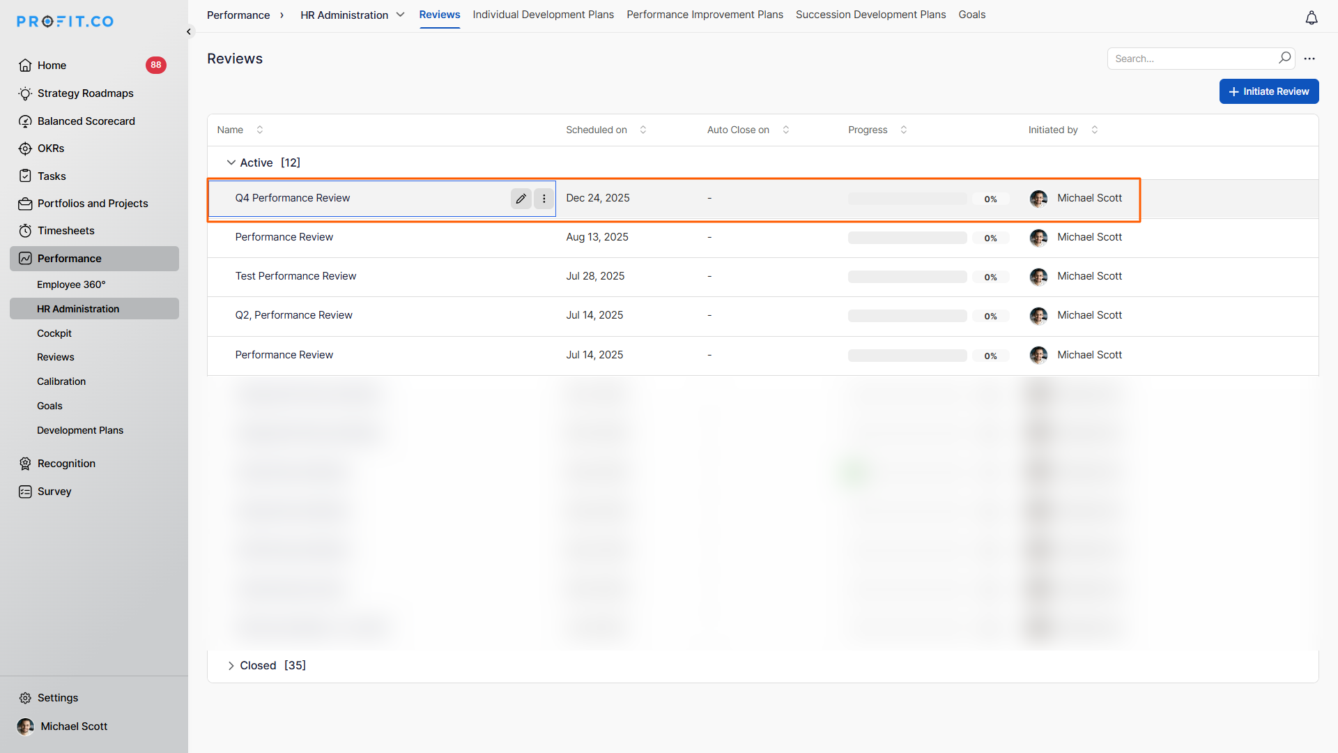 - The initiated review appears on the Performance Reviews page