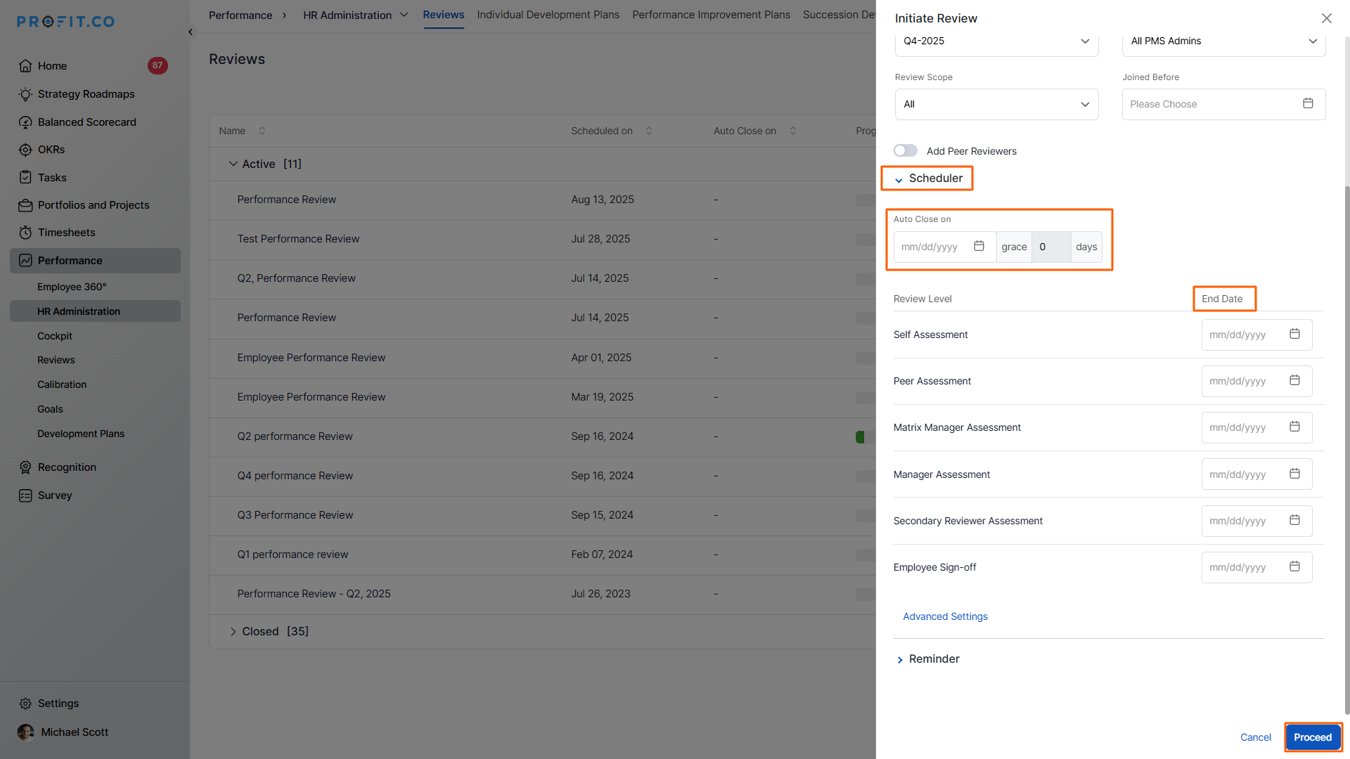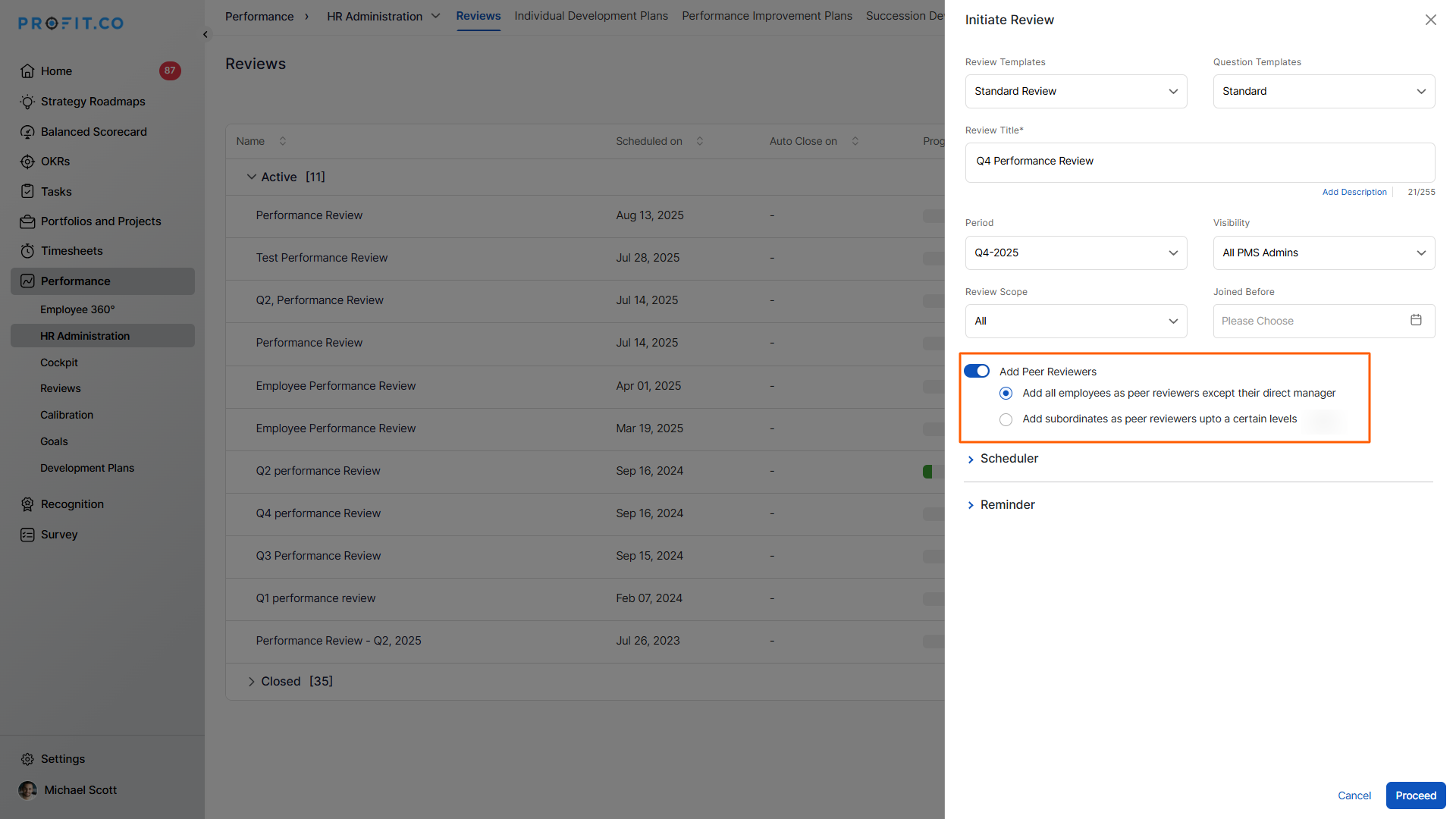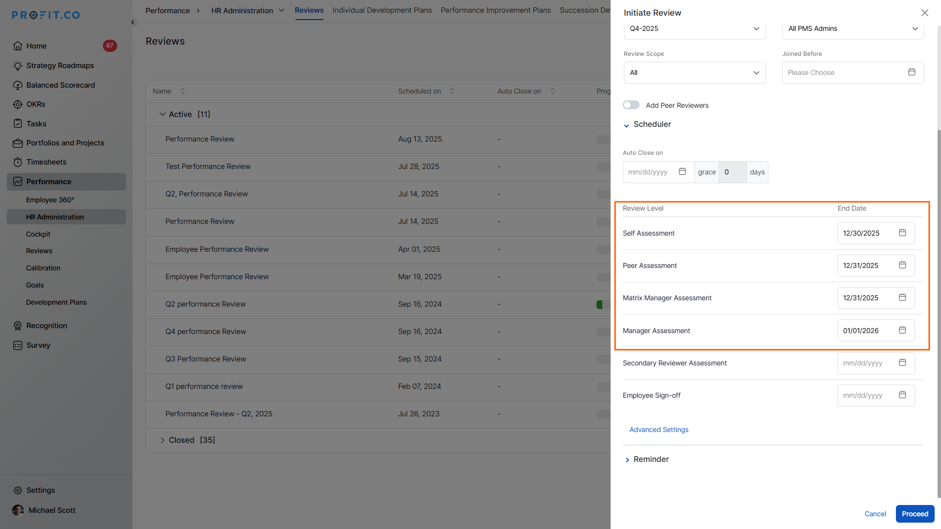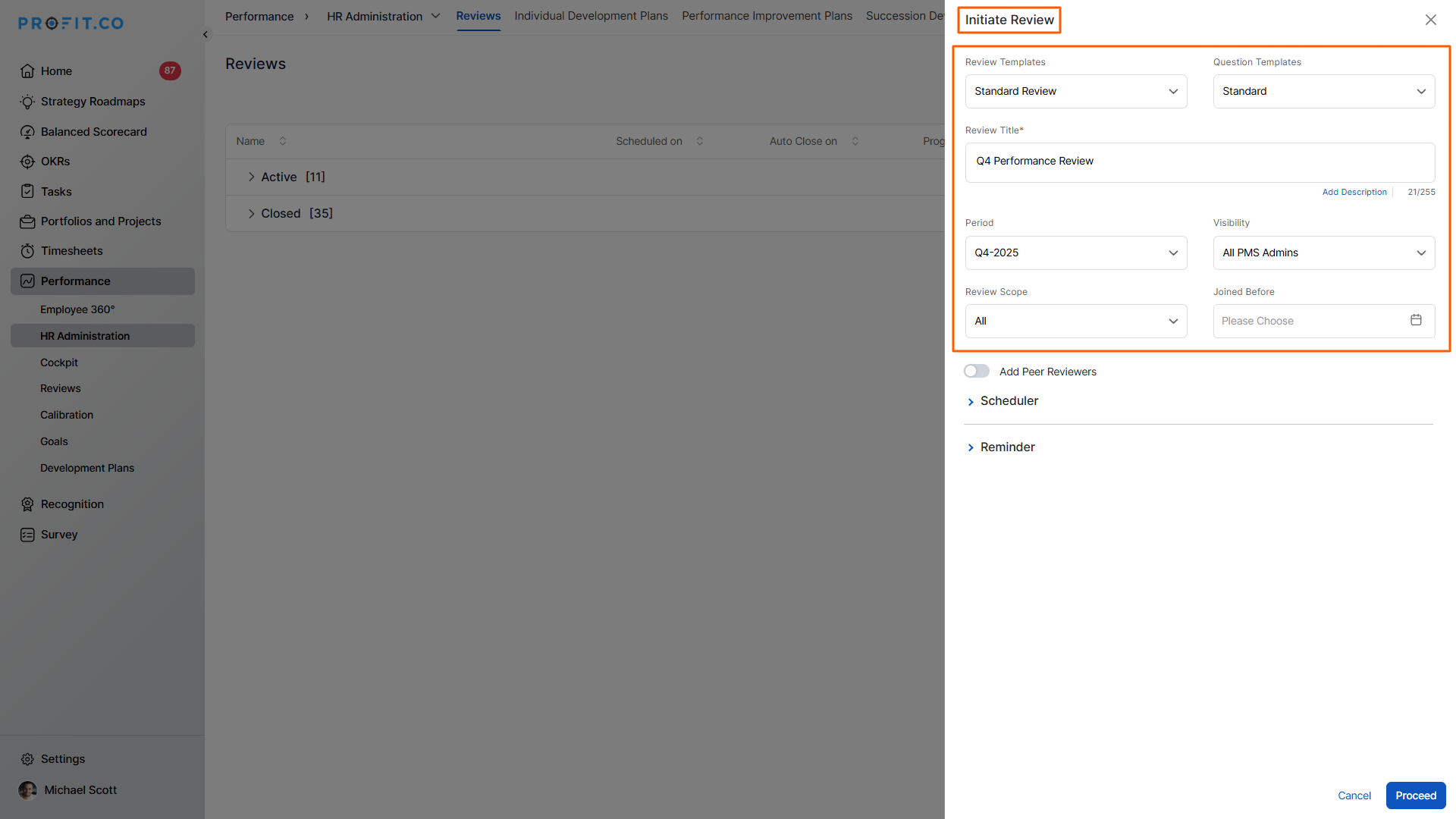 Profit.co allows managers and HR teams to initiate structured performance reviews for employees using predefined templates, schedules, and assessment scopes.