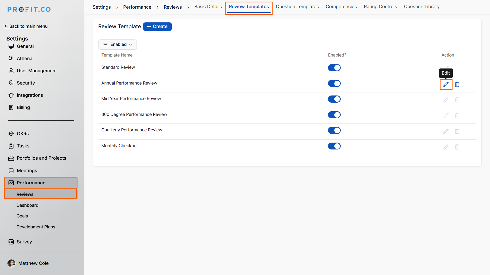 - Select the Review Template you want to configure and click on the Edit icon.