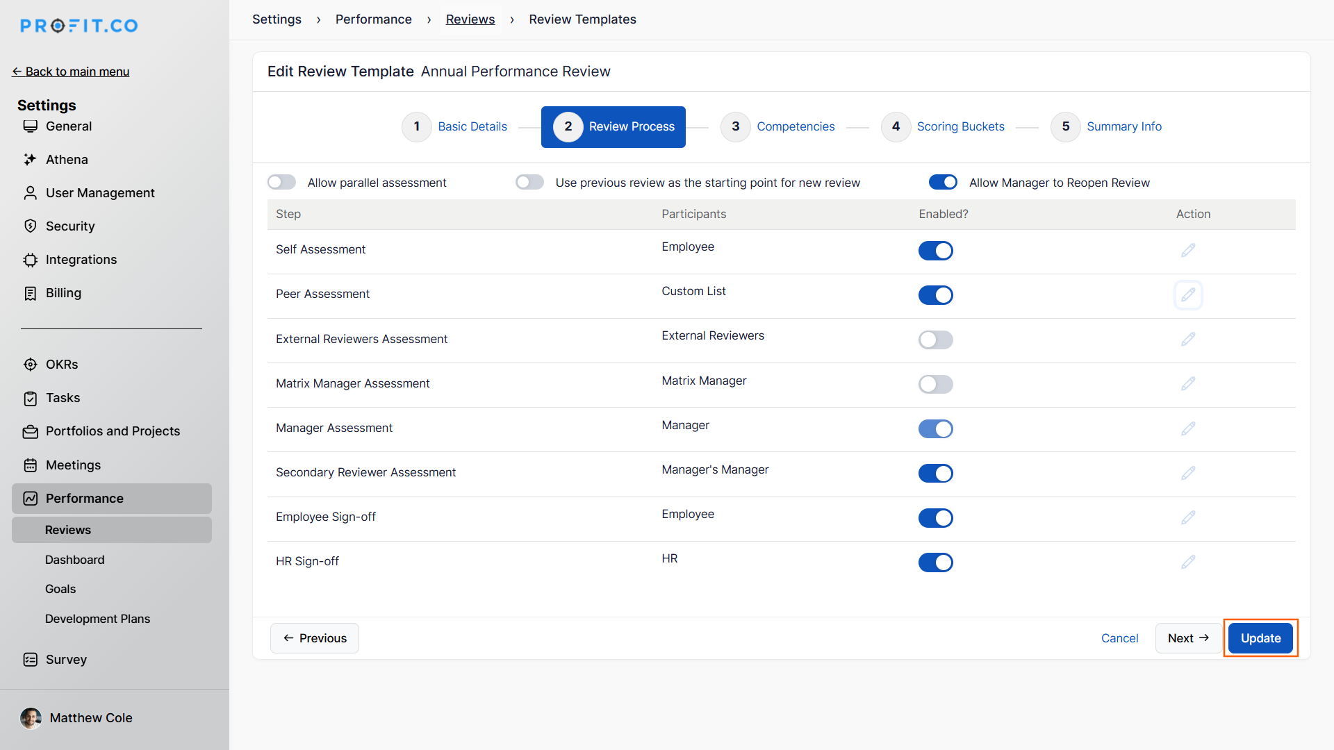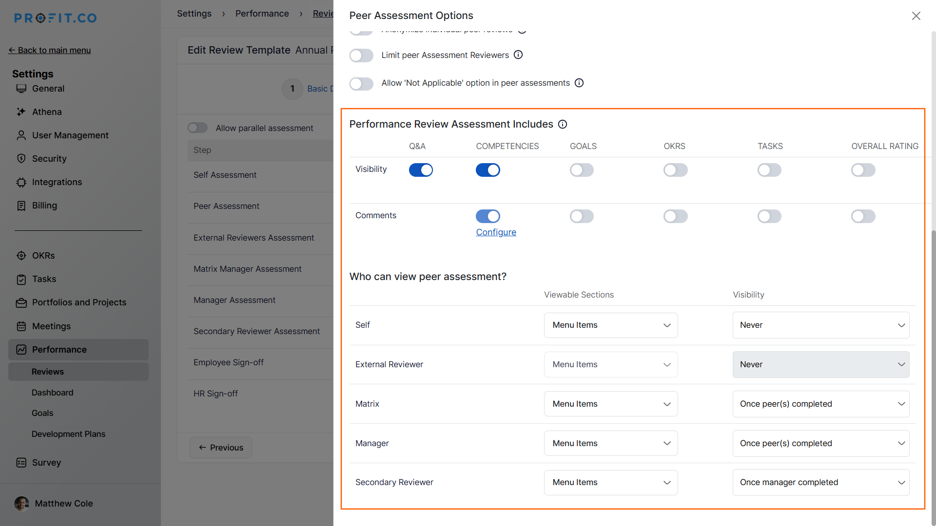 Follow these steps to set up and customize peer assessments in Profit.co: