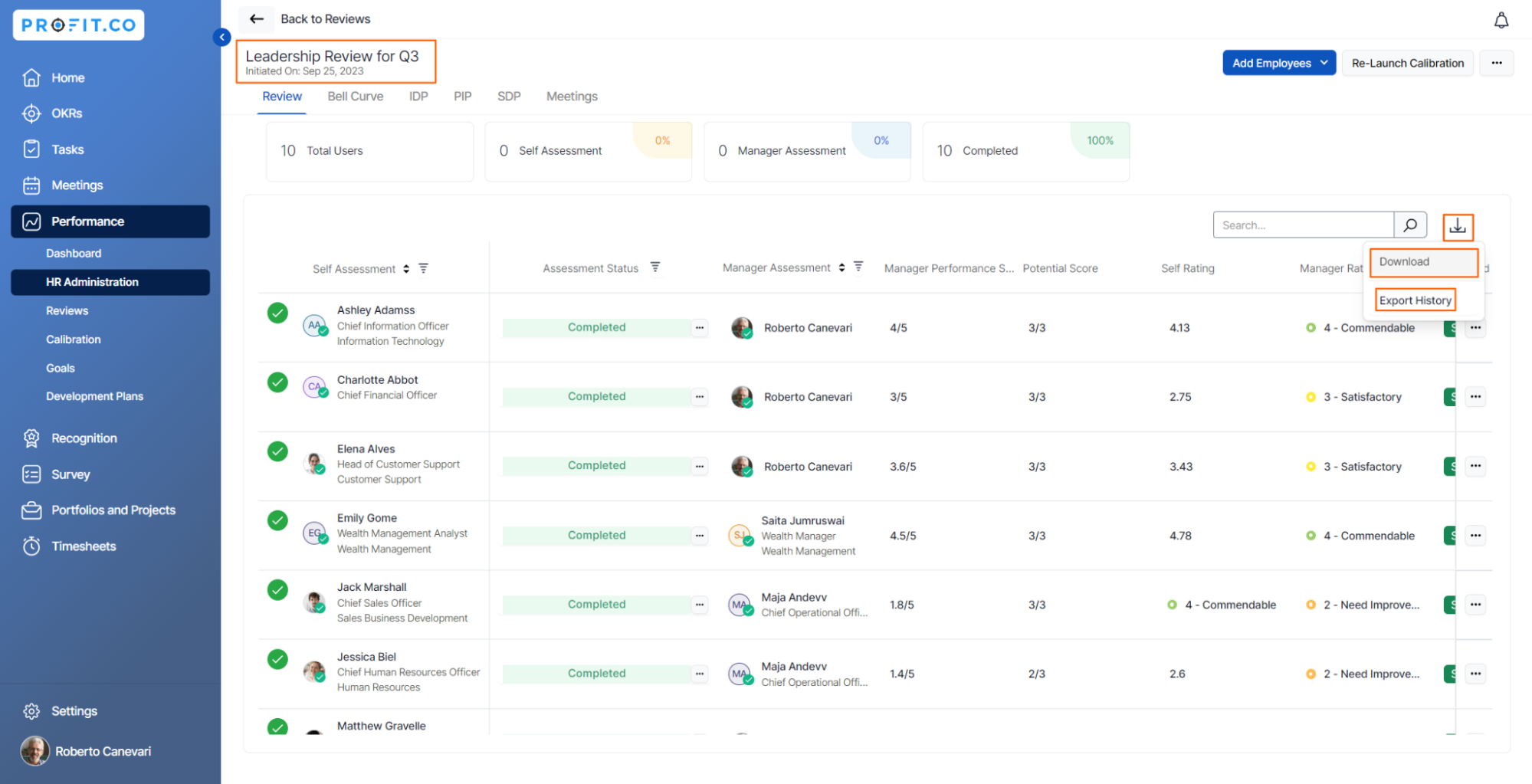Profit.co provides an option to export performance review data from the HR Dashboard.