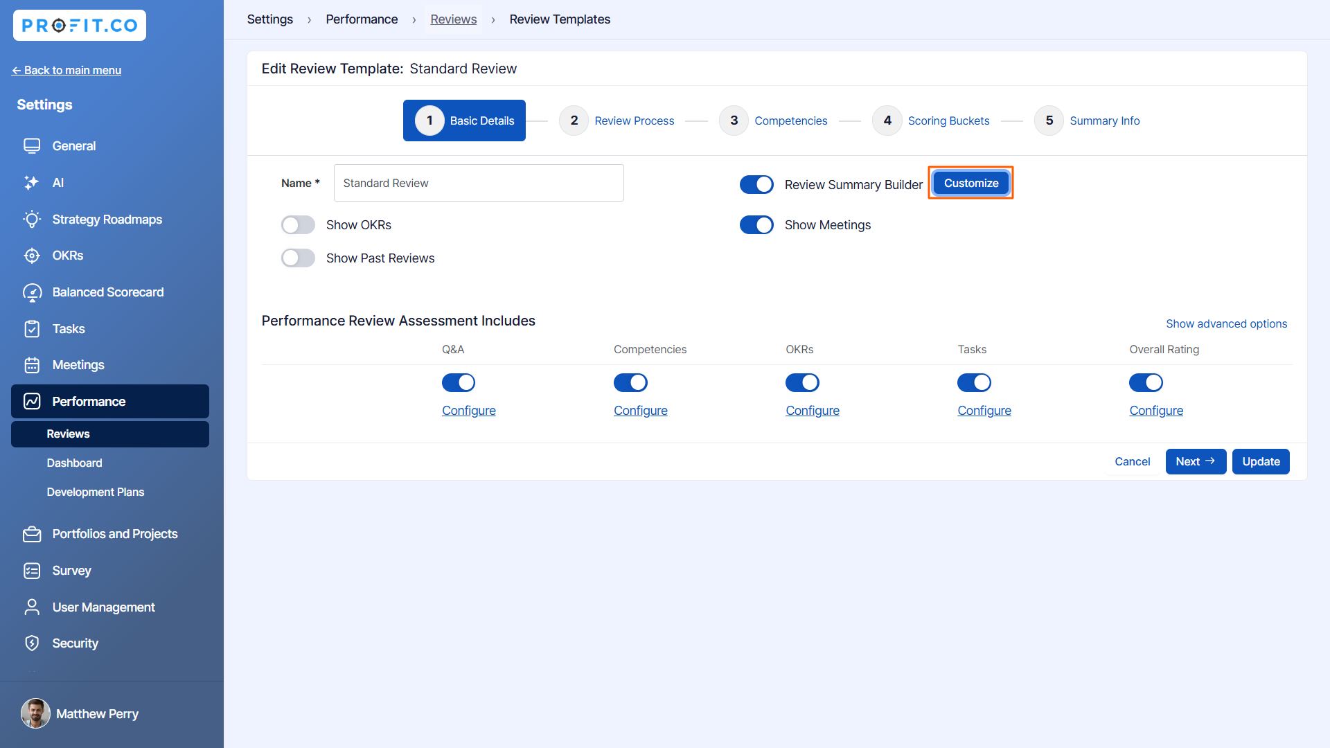 Go to Settings → Performance → Reviews from the left navigation panel and switch to the Review Templates page. Click on the Edit icon of your preferred template.