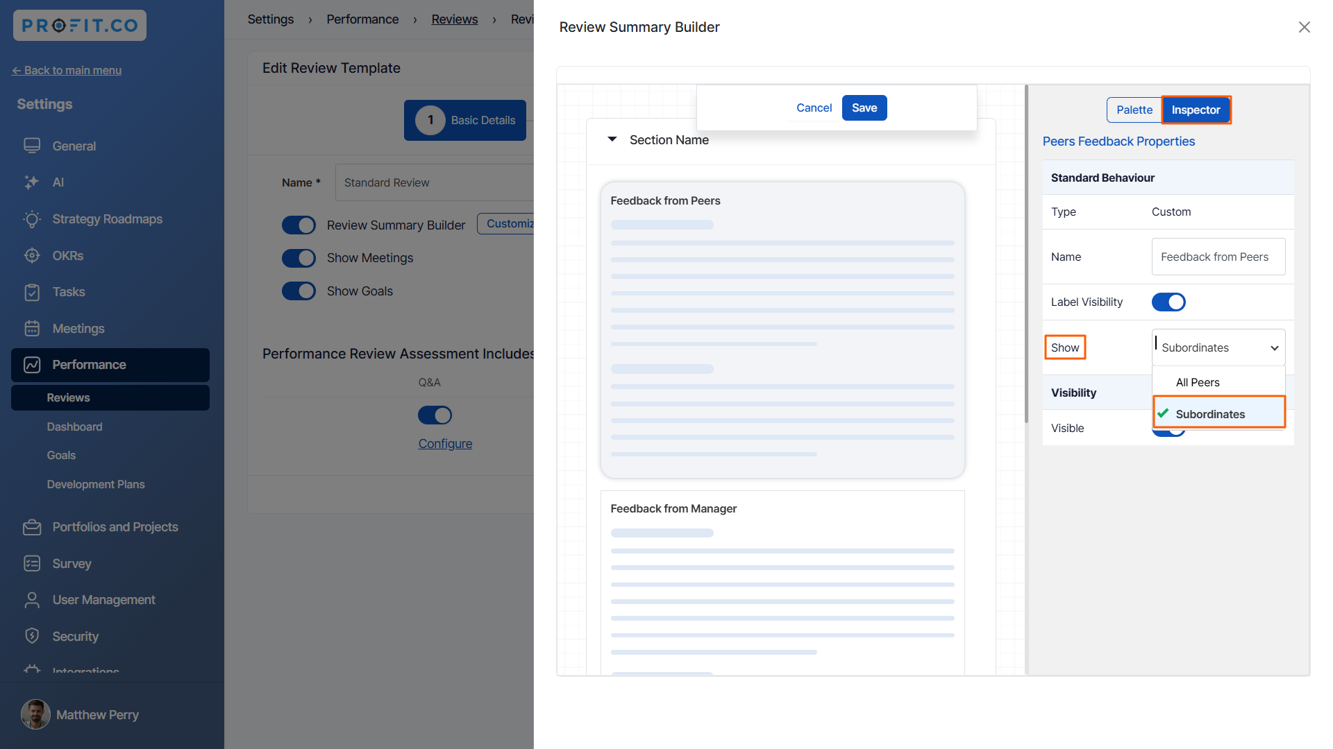 In the Review summary builder, the profit.co system allows configuring the “Feedback from subordinates” when you drag & drop the “Feedback from peers” widget and select “Subordinate” in the shown drop-down.