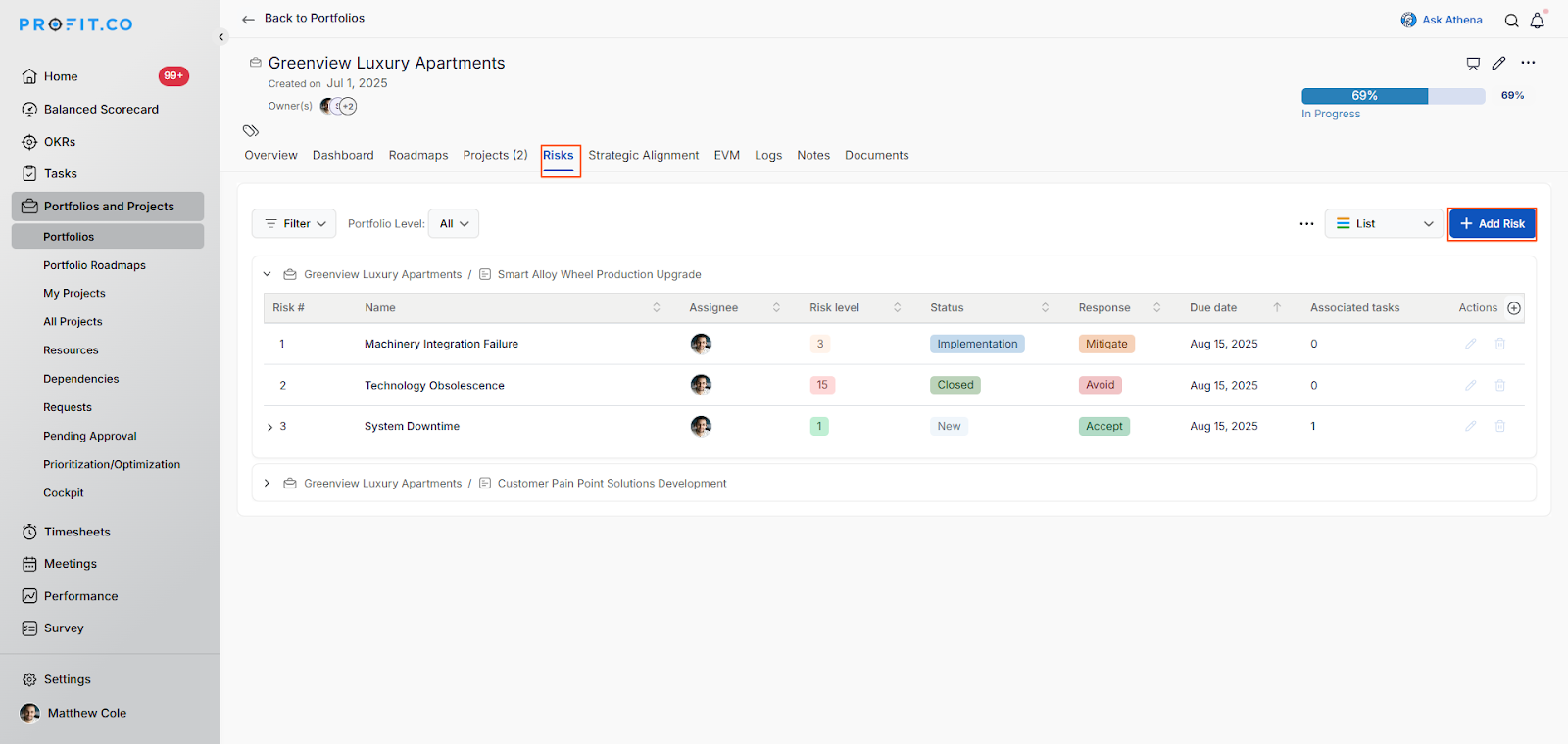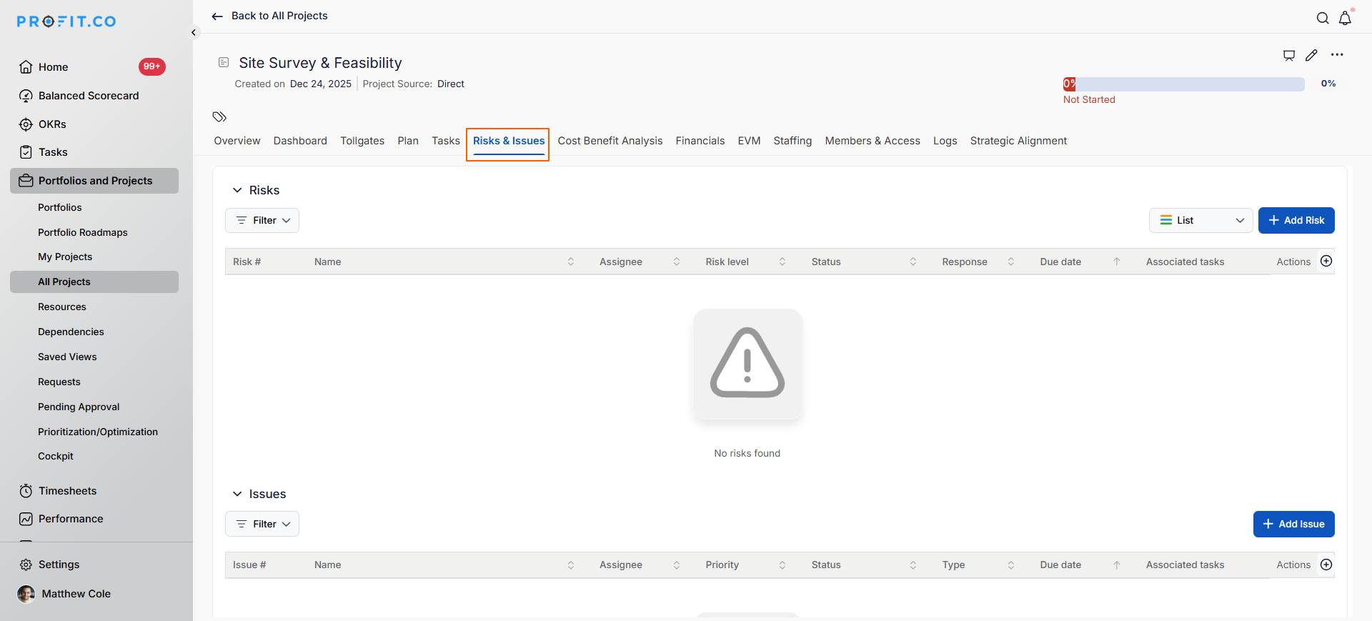 - Profit.co provides a centralized Risk Log at the portfolio level. Navigate to any Portfolio → Risks tab to view and manage risks across all portfolio projects in one place.