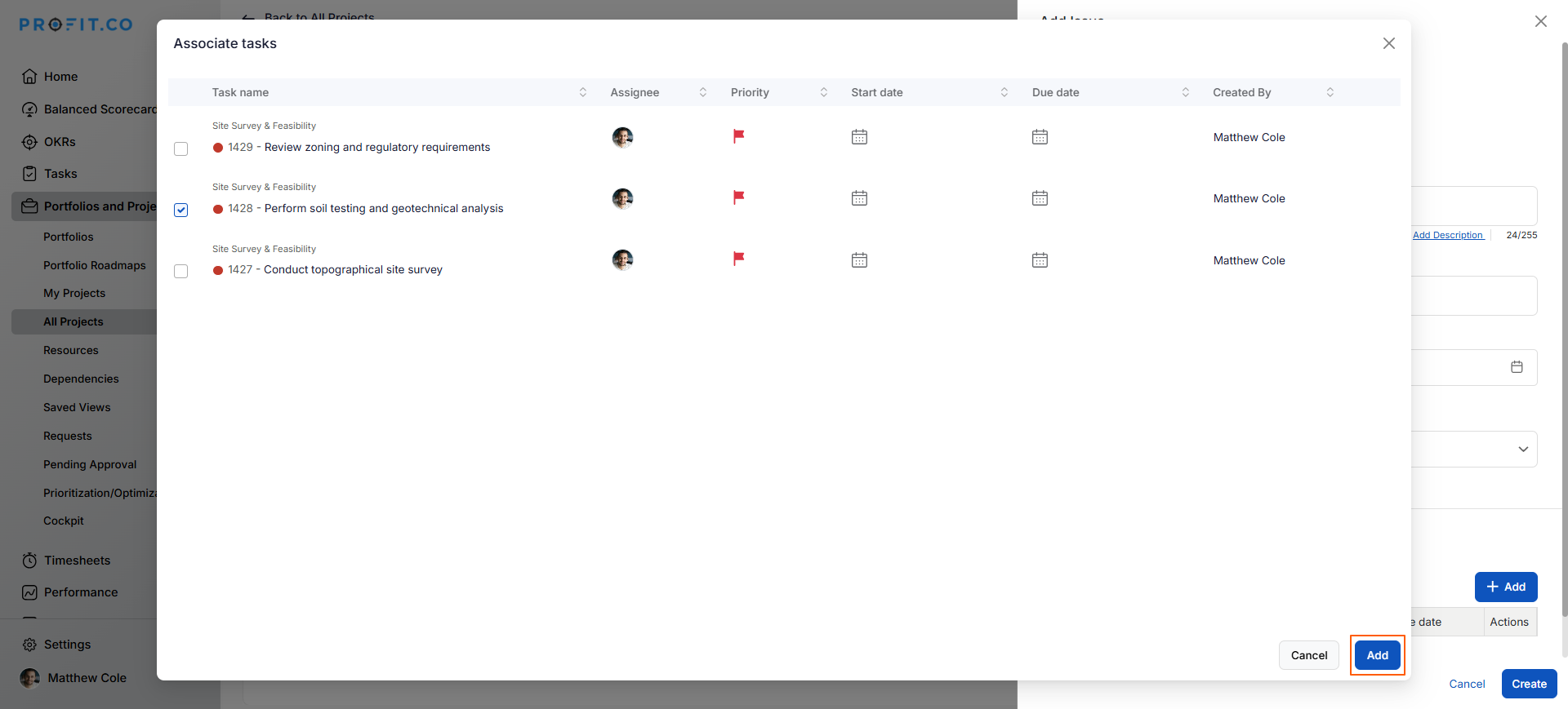 - Select the tasks. Tasks associated with issues are used for resolution purposes, helping to address and resolve the problem after it has occurred.