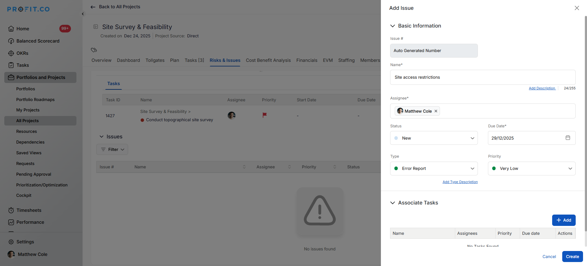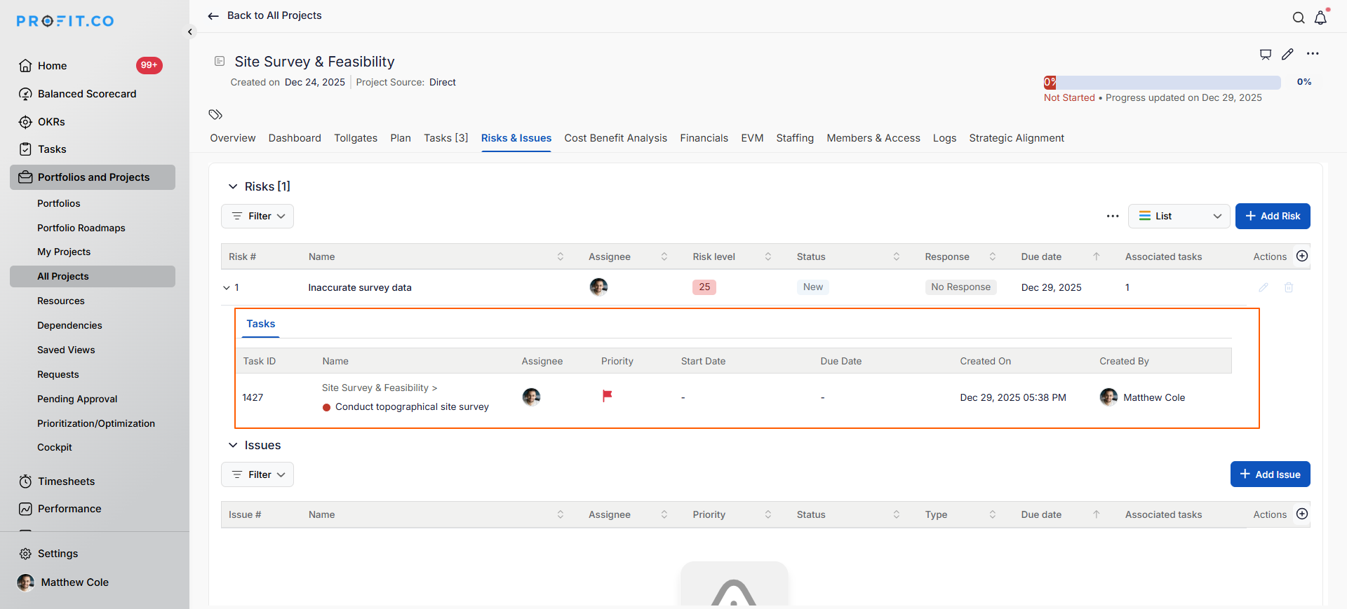 Profit.co offers users the ability to manage project uncertainties with the Risks & Issues option in the Project and Portfolio Management (PPM) module.
